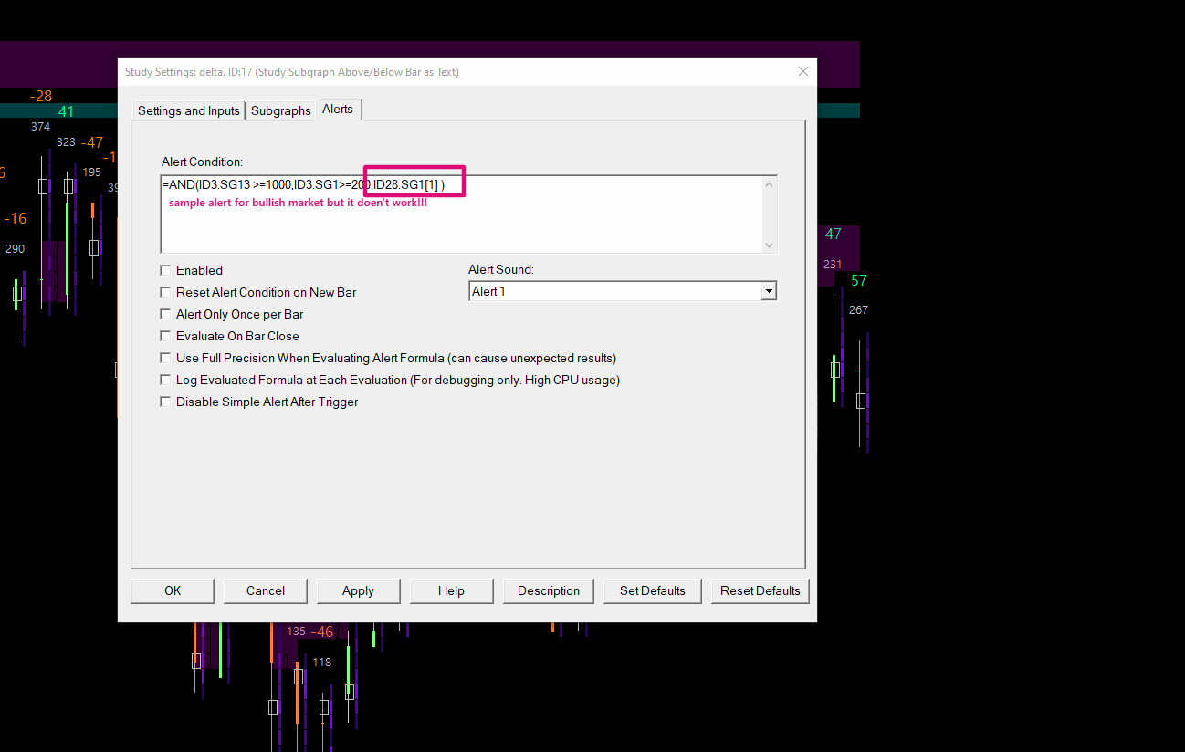PLEASE I WILL BE GRATEFUL IF ANYONE CAN HELP ME WITH THIS, I AM NEW TO SIERRA CHARTS AND PROGRAMMING/CODING MY GOAL IS TO BE ALERTED WHEN //(ALERT BULLISH CONDITIONS) A)MY VOLUME CHART STUDY HAS A VALUE >= XXXX B)MY DELTA CHART STUDY HAS A VALUE >= +XXX C)MY CANDLE STICK CHART OVERLAY SYMBOL IS BULLISH for a +VE DELTA VALUE and not alert if the candle is BEARISH The Above two thus (A & B) I have already figured out but how to add the extra filter for a bullish or bearish candle alert when delta is positive for bullish and not alert if candle is bearish is my current challenge Attached are images describing my input values |