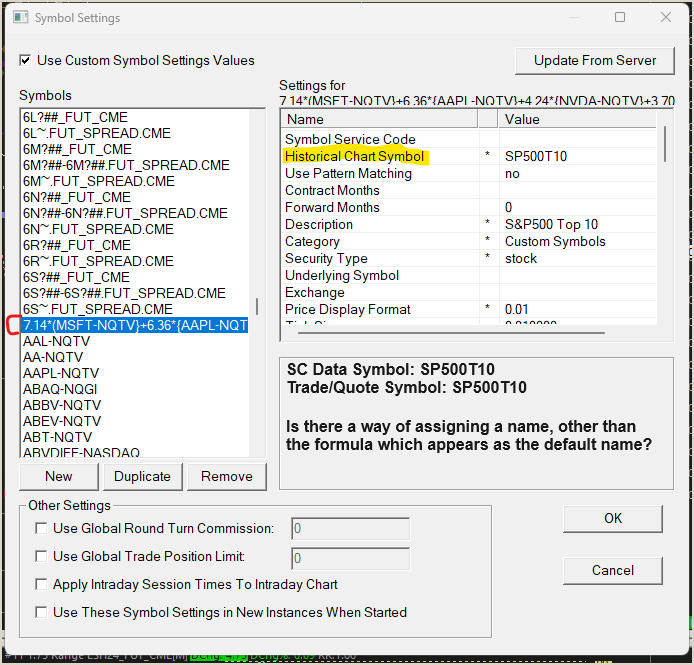 John (or Support), Is there a way of assigning a default name (e.g., SC500T10) to the synthetic (formula-based) symbol, so that it can be easily referenced? For example, when using sc.OpenChartOrGetChartReference to open a chart, specifying a compact name rather than the lengthy formulaic name. The formula consists of 10 weighting factors and 10 symbols... there must be a way to name or alias this? I tried the following new symbol settings, in hopes the name would appear in a [File][Find Symbol] search, to no avail: Historical Symbol: SP500T10