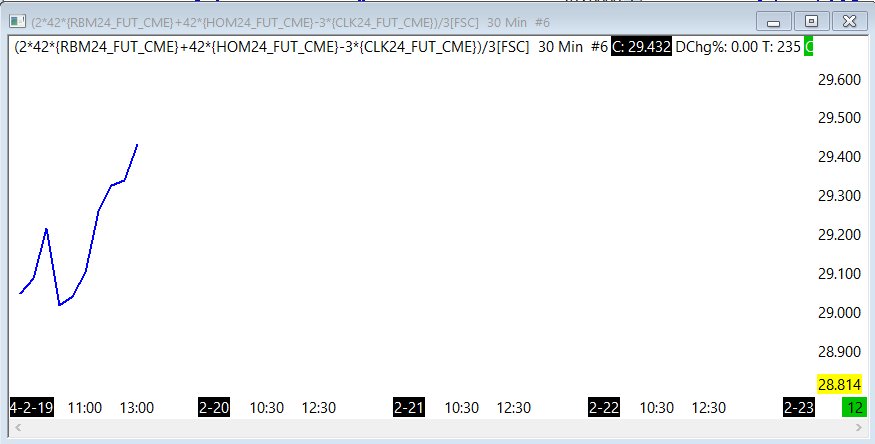 Made a custom symbol-2*42*{RBM24_FUT_CME}+42*{HOM24_FUT_CME}-3*{CLK24_FUT_CME}. When I try to bring it up it give be a [FSE} message. The individual components seem to chart( RBM24_FUT_CME, HOM24_FUT_CME, and CLK24_FUT_CME) by themselves.