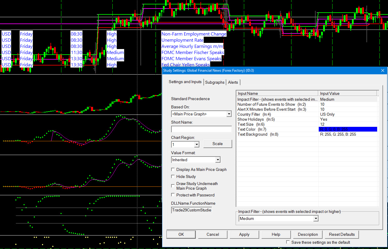 @sstfrederik thanks! here are a couple suggestions :) 1) add option where if added to intraday study... allow addition of VERTICAL DATE/TIME lines to be added in fill space (with text of the event name & importance). that way when the chart is scrolling, it will show up as an upcoming vertical line intersecting with price bars 2) add option to see medium AND high importance |