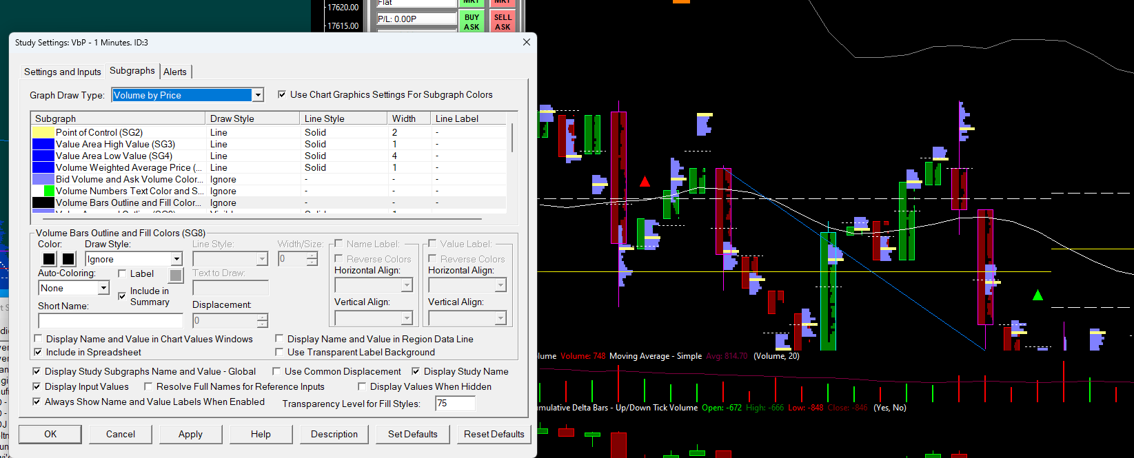 The reason you are seeing the profile in the candle is because you are setting the profile to be black, and since you are using a filled candlestick, it is displaying above the bar. The solution would be to set the option for "Draw Study Underneath Main Price Graph" for the Volume by Price study so that it is "Enabled" (has a checkmark). Then the profiles will be behind the bars (but this will also include the Value Area). Refer to the following: Chart Studies: Settings and Inputs Tab >> Draw Study Underneath Main Price Graph (in the same Chart Region) For the most reliable, advanced, and zero cost futures order routing, use the Teton service: Sierra Chart Teton Futures Order Routing |