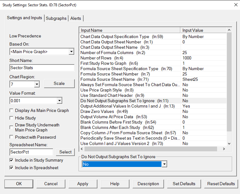 Hi, Appreciate the response but I have "Do not output subgraphs set to ignore" to NO and I also am not ignoring that column. I've attached pics to show. As you can see have NO and the column I want the 30m previous close SG4 is set to Dash but its not showing up in spreadsheet. Is there any limit to how many studies and sub graphs can be in there? |