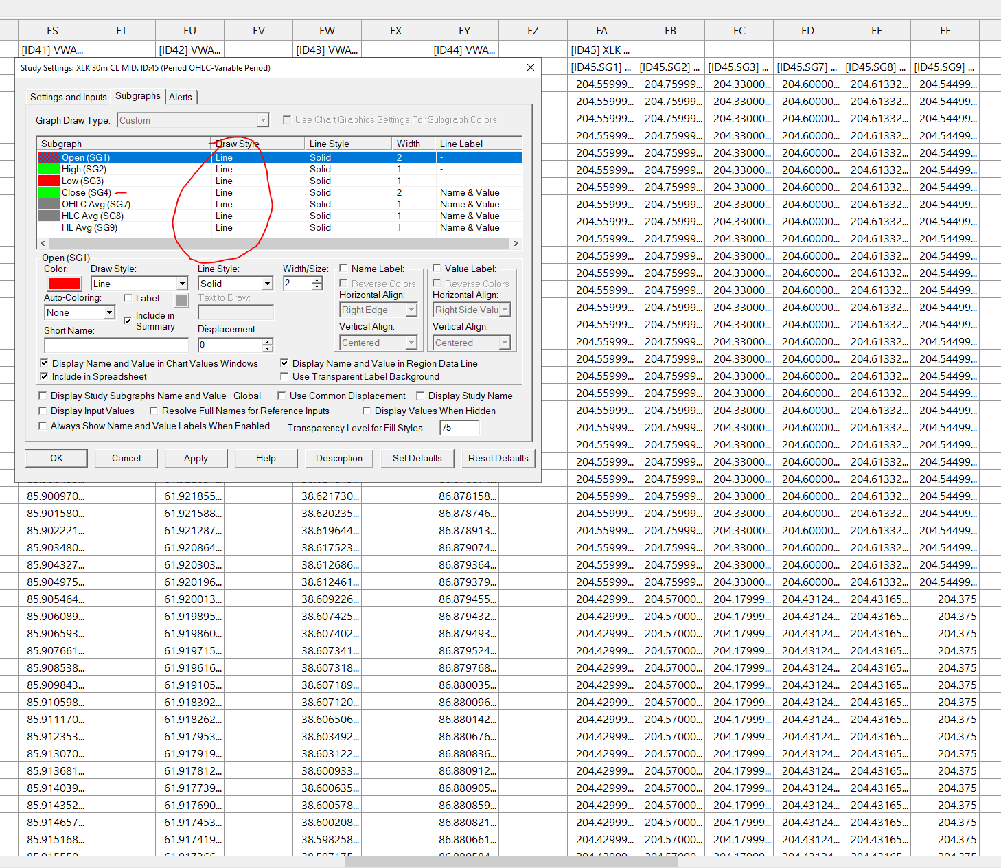 In the chartbook you sent, Study ID45 has only the Close and HL Avg subgraphs set to display and your setting for "Do Not Output Subgraphs Set to Ignore" is to "Yes". And also, you had the "Close" subgraph not set to "Include In Spreadsheet". When we add the "Include to Spreadsheet" for that item and then clear and recalculate (as per Sawtooth's suggestion) then everything is showing as we expect. Attached is an image showing this for that particular study. For the most reliable, advanced, and zero cost futures order routing, use the Teton service: Sierra Chart Teton Futures Order Routing |