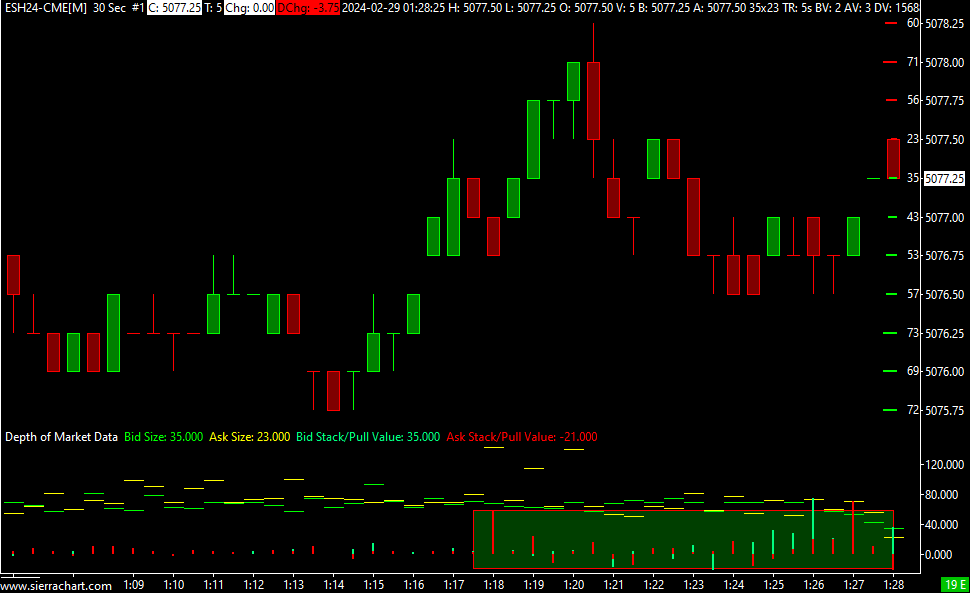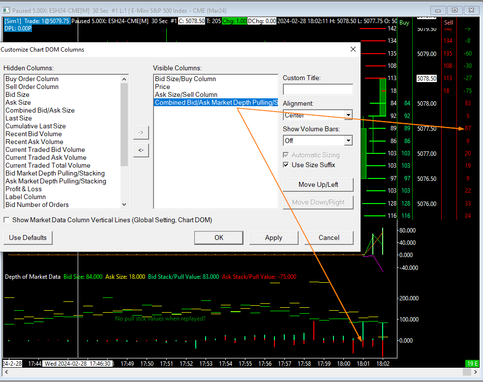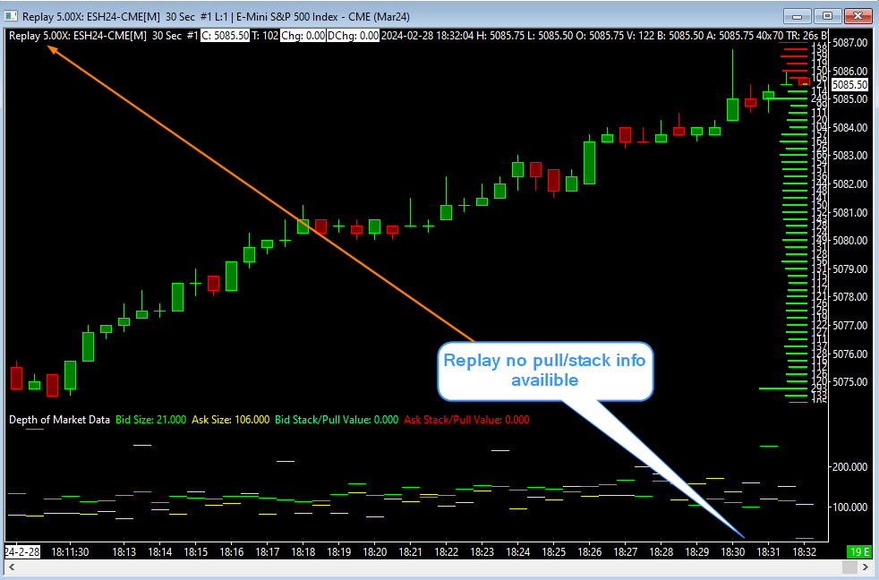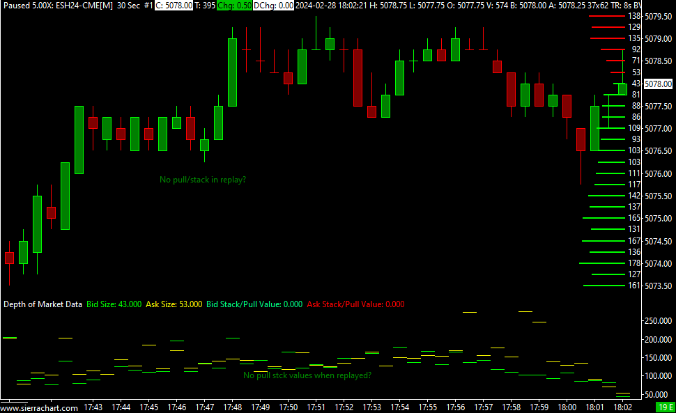 It seems that the ACSIL function sc.GetBidMarketDepthStackPullValueAtPrice() does not work in replay. * I have confirmed that I have the depth data for the replay period * It replays in the Trading DOM and displays Pull/Stack numbers in the column https://www.sierrachart.com/image.php?Image=1709170826997.png But when using a study that has sc.GetBidMarketDepthStackPullValueAtPrice() or sc.GetAskMarketDepthStackPullValueAtPrice() it doesn't populate with data. See two attached pics. One live the other replay. No data for replay. https://www.sierrachart.com/image.php?Image=1709170958180.png Is this meant to work in replay and I'm doing something wrong? |