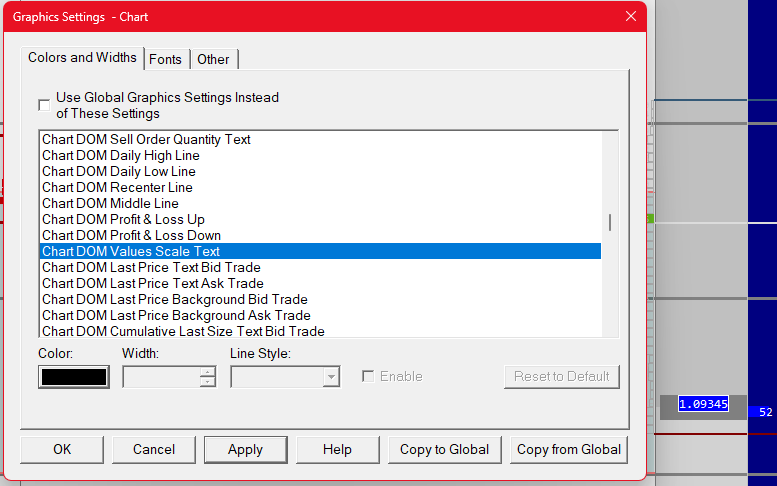 Make sure you are changing the text color in the appropriate location. There are both Global and Chart specific graphics settings. Refer to the following: Graphics Settings: Using Different Color and Graphics Settings for Specific Charts Also, the color of the prices in the ladder depends on the state of the option for "Trade >> Trading Chart DOM On". When this is NOT on, then the color is set with the graphics setting for "Chart Values Scale Text Color". Otherwise, when the option is enabled, then the color is set with the graphics setting for "Chart DOM Values Scale Text". Refer to the following: Graphics Settings: Chart Values Scale Text Color Customizing Fonts, Colors, Line Styles, and Widths for Chart Trading, Chart DOM, and Trade DOM: Chart DOM Values Scale Text For the most reliable, advanced, and zero cost futures order routing, use the Teton service: Sierra Chart Teton Futures Order Routing |