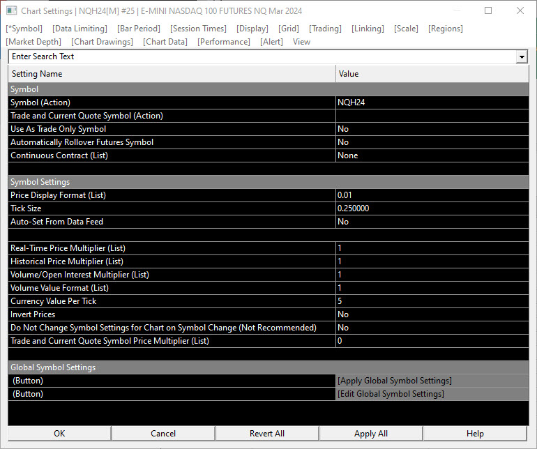 What is the setting for "Chart >> Chart Settings >> Symbol >> Currency Value per Tick" for the NQ chart?