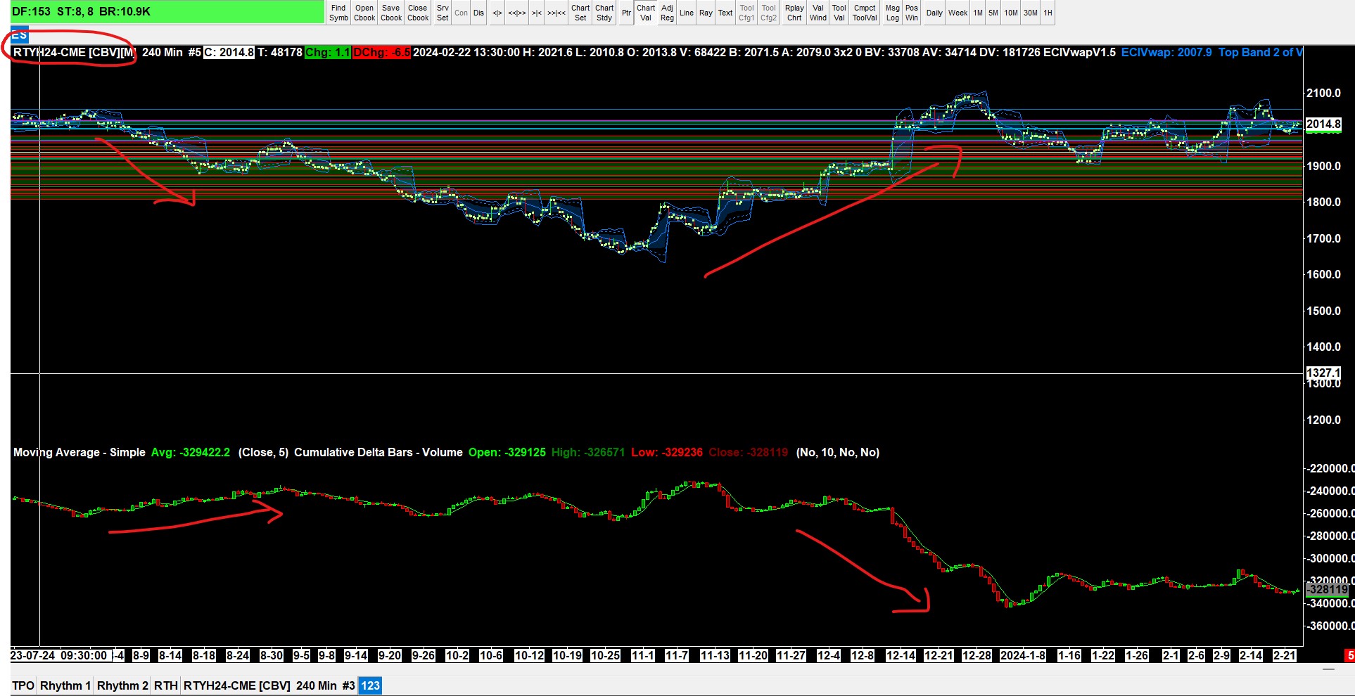 Hi, Good day to you. I tried to use CVD with no reset between one session to another but I am getting Volume Delta thats totally inverse correlated to the price. For example (attached a photo as well), The price in russell is going up but the CVD is going down. When the market made the top, the CVD is making the bottom. I tried using CVD in Tradingview (User created code) and the CVD graphs make more sense in Tradingview. Is there something to tweak? Kindly let me know. Thank you! |