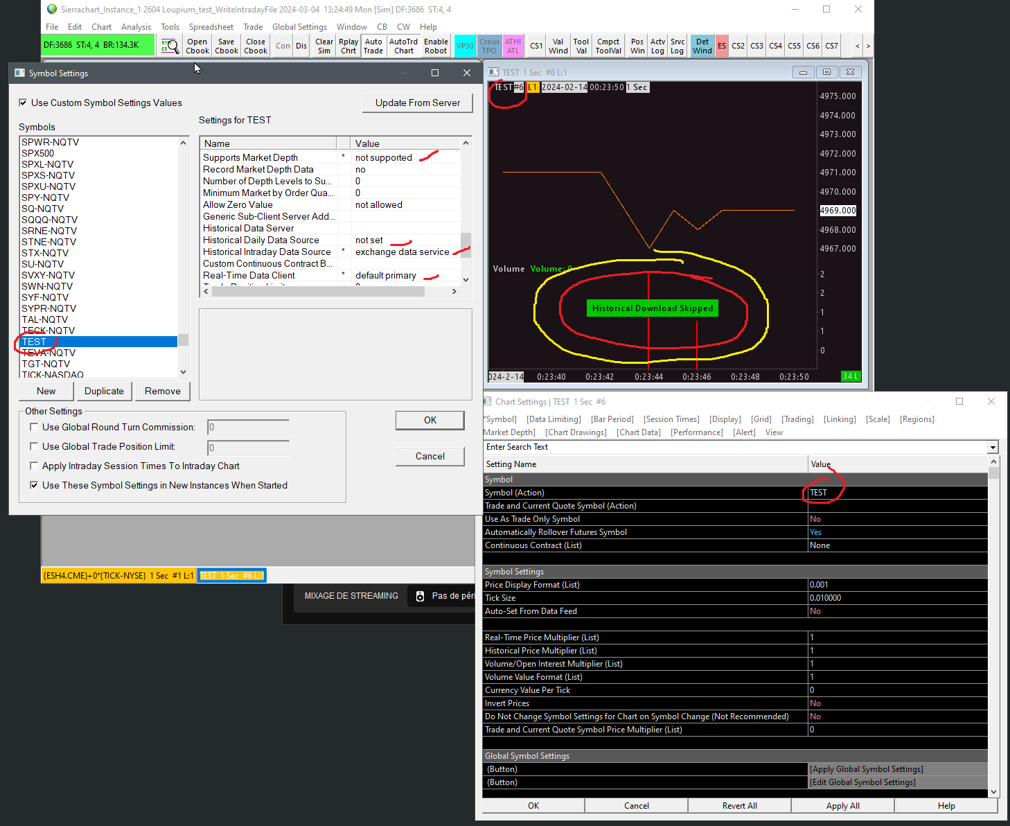 Edit : the title was cut: How to remove the "Historical Download Skipped" panel on a custom scid. Hello, I do calculations on a lot of stocks at the same time. The problem is that not all stocks have the same rhythm. For example on my charts including the timefame in seconds, most of the stocks have trades carried out during this second, but some stocks do not have trades carried out for several seconds. So there is an option to activate the filling of holes in Sierra (chart setting -> Bar Period -> Include Columns Whith No Data), this solves the problem of past holes, but not the trade holes currently being created. For example, if for the last 10 seconds there was no volume on the stock, then the chart will not move and fill this hole. It will fill this hole 10 seconds after the last trade. The problem is that I am doing price derivative calculations, and therefore this calculation is blocked for 10 seconds because of that. Worse, Sierra extends the past into the future, which makes the calculation completely wrong. Unfortunately, unless I'm mistaken, there is no option in Sierra that allows you to correct these holes being created. So I said to myself, I was going to create a study that creates a SCID file that fills with the original stock (TEST.scid), but when there are holes being created, it fills them with a trade at volume 0 every second. I did a test with a study test, and it works. To do this, I put its settings in the setting symbol (image attached). I had to do several tests because there is no documentation of the symbol setting for a custom .scid. After doing this, the new problem is that a sign saying "Historical Download Skipped" remains displayed all the time, right in the middle of the graph and does not disappear from the graph. The question is how to remove this perpetually displayed panel which bothers me when viewing the graphs ? I also attach the log file: Date Time Of Last Edit: 2024-03-04 16:31:18