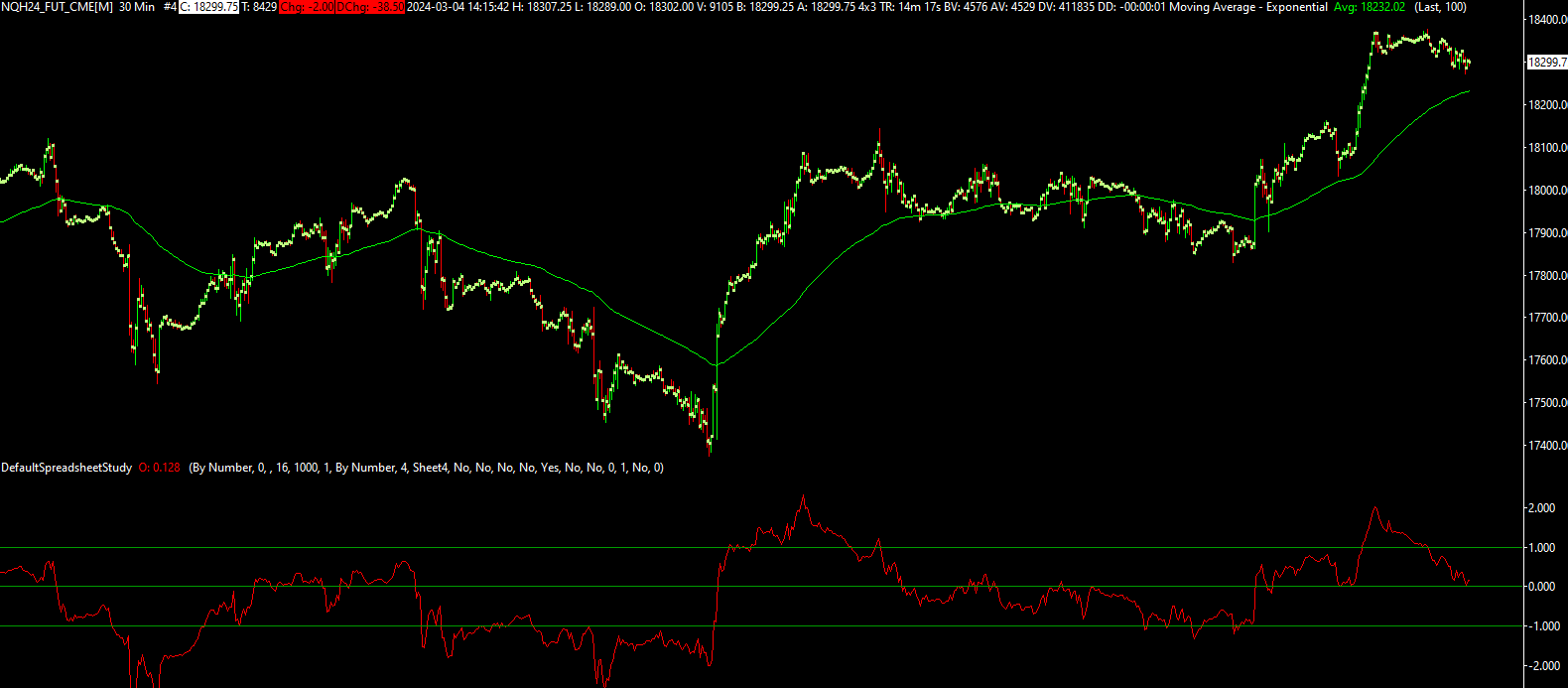 You are taking the natural log of the EMA from the current bar divided by the EMA of the previous bar, and then using that to determine the Slope and Intercept for an input into the Z-Score. The formula we use in our Z-Score study is the following Z(index) = ((X(index) - SMA(X)) / SD(X) Where X is the Input Data, SMA is the Simple Moving Average of the data, and SD is the Standard Deviation of the data. Therefore, for what you are doing in a spreadsheet, your formula would be the following = (ID0.SG4@3 - ID1.SG1) / $N$3 Where ID0.SG4 is the Close, ID1 is the EMA study with SG1 being the EMA subgraph, N3 is the cell that holds the Standard Deviation of the EMA (not the LN(EMA/EMA(-1)). For the most reliable, advanced, and zero cost futures order routing, use the Teton service: Sierra Chart Teton Futures Order Routing |