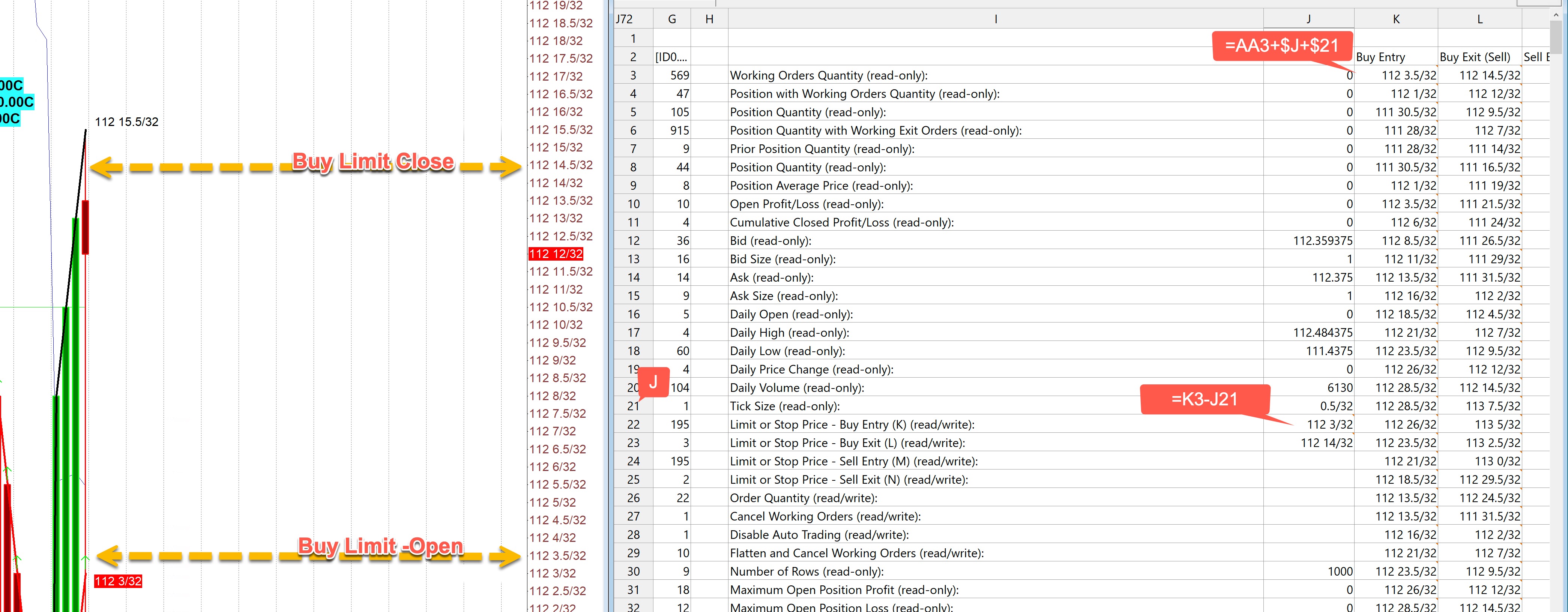 Signals are in columns K3-N3 Prices are in J22-J25 Order types are in J71-J74 Columns K-N are the signal columns and need a non-zero value at the bar/row where you want the signal, not in every row. A TRUE signal must follow a FALSE signal. Create a formula in Column O or higher, and then reverence it with another formula in K3 that goes TRUE when you want. Where is price when the value is below 112 3.5/32 ? If price is below the value, use a Buy Stop, if it's above the value, use a Buy Limit. If it could be either, use a conditional IF statement in cell J71. If you are entering/exiting a position intrabar, be sure to set 'Signal Only On Bar Close' to No. If you have 'Signal Only Once Per Bar' set to Yes, be aware of this: Spreadsheet Systems, Alerts and Automated Trading: Signal Only Once per Bar |