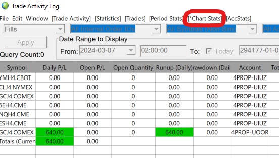 You mentioned above that you have the option for "Only Orders from Chart" enabled. Make sure this is NOT enabled (i.e. disabled) by ensuring that you do not have a checkmark next to it. In particular, you want this for the charts in the other windows where you are keeping the 15 minute charts for each product. From everything you are stating, this should resolve the issue, as you were not having those charts show any information. With the option disabled, those charts will show the information, and it will then show in the "Chart Stats". For the most reliable, advanced, and zero cost futures order routing, use the Teton service: Sierra Chart Teton Futures Order Routing |