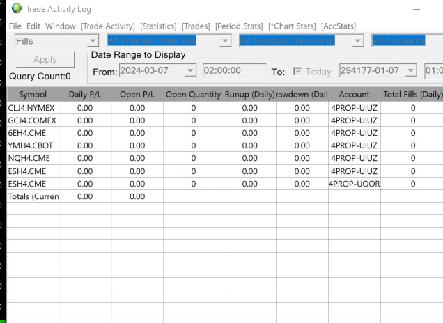 We assume you are looking at the "Chart Stats" page of the Trade Activity Log. As such, only the active symbol of the chart, at that time, will be what shows in the Trade Activity Log. If you use one of the other pages, then you will be able to see all the trades for all symbols from the same chart. But that specific page will not since it is chart specific. Refer to the following: Trade Activity Log: Trade Statistics for Charts (Chart Stats) Tab For the most reliable, advanced, and zero cost futures order routing, use the Teton service: Sierra Chart Teton Futures Order Routing |