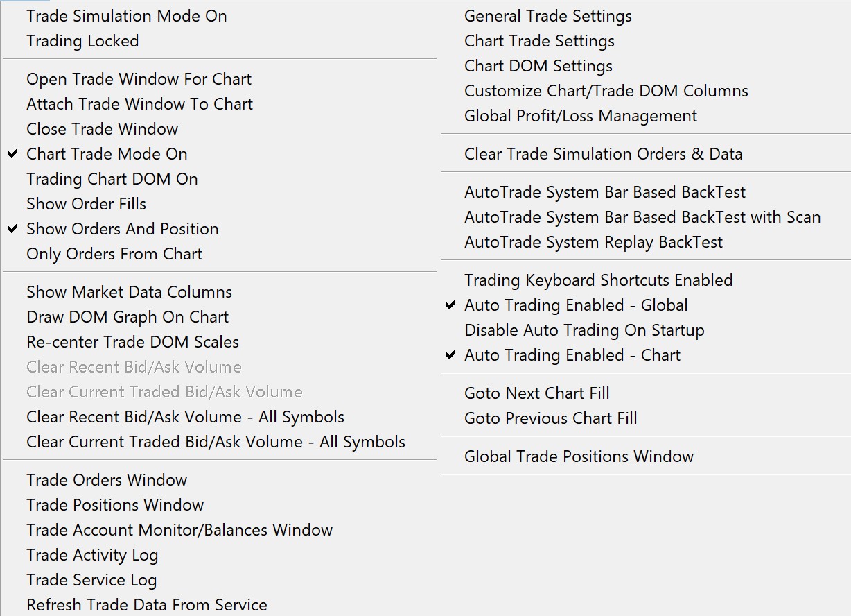 The "Trade Statistics for Charts" works in the way we described and in the documentation. The only thing we can think is that you were looking at a different page on the Trade Activity Log where you were able to see all the open positions - such as the "Trades" page. Or perhaps you had the "Trade >> Trade Positions Window" open. With regards to the multiple monitors, how are those charts setup? Are you using different installations of Sierra Chart or are they one running application with the charts detached and displayed on the different windows? Also, make sure the option for "Trade >> Only Orders from Chart" is not enabled, or this will prevent the display of orders from other charts to show on that chart. Refer to the following: Trade Menu: Only Orders From Chart (Trade menu) For the most reliable, advanced, and zero cost futures order routing, use the Teton service: Sierra Chart Teton Futures Order Routing |
