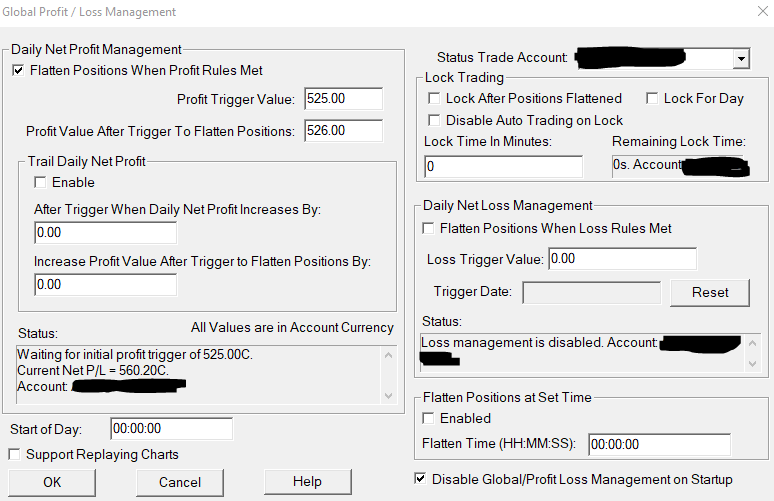 Will this flatten my trade and account after hitting $525 in profit for the day? And $526 in the Trigger to flatten positions? Yes I still have to set the start of day time. I will set it for NYSE open. I still dont understand how the Profit Value After Trigger To Flatten Positions works. It makes no sense. Why does it even exist? Why cant it just be the check box and value that when it hits a certain price it just flattens the account??? SOOOOO easy. It seems you not only have to turn this on with the Flatten Positions When Profit Rules Met box but ALSO UNCHECK the Disable Global Profit Loss Manag. on Startup box??? roflol.. a button to turn it on and then one to turn it off on startup? i cant stop laughing.. laser guided hammer to pound in a nail.. Hopefully the picture attaches as its a menu window and you cant copy those easily. |