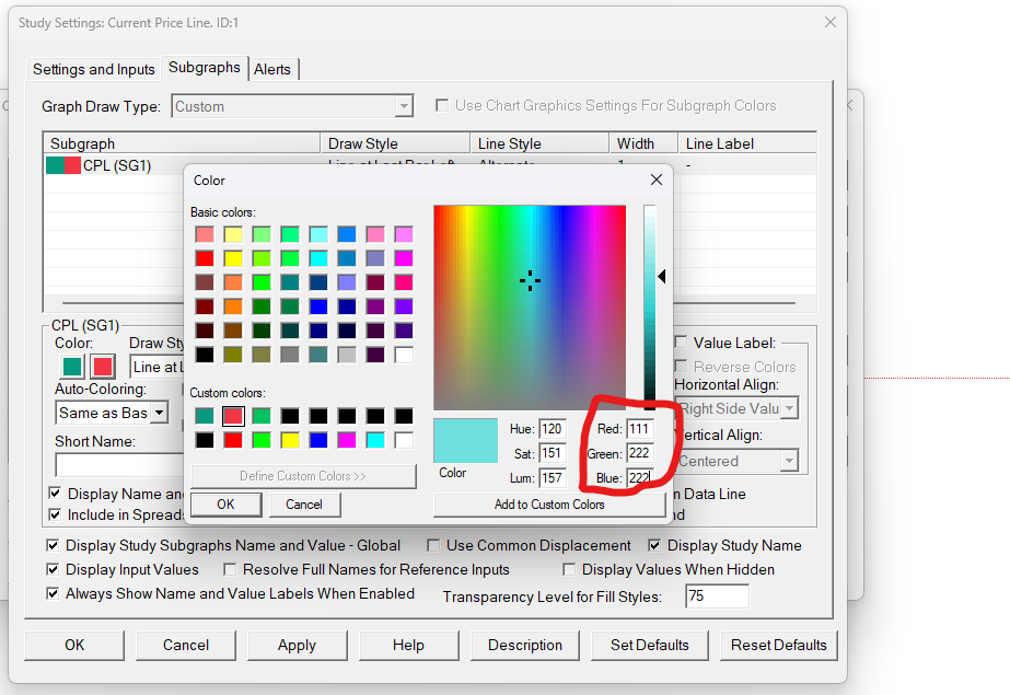 Can you please get us a screenshot of what you are seeing, as the "color picker" window where you can set the RGB colors by number is a standard windows window and not one of our own. We are not seeing an issue with this, so we are wondering if it is something else.