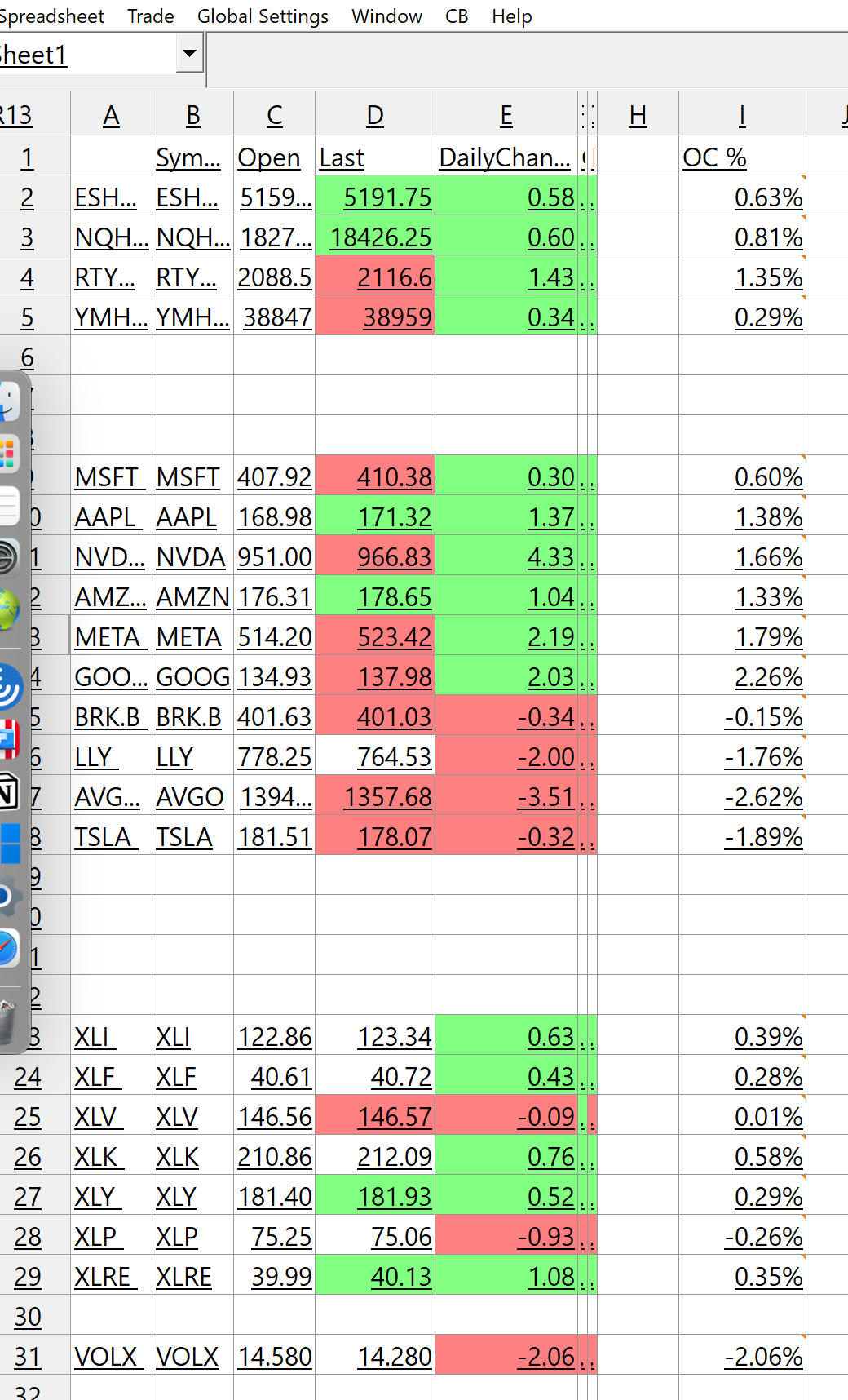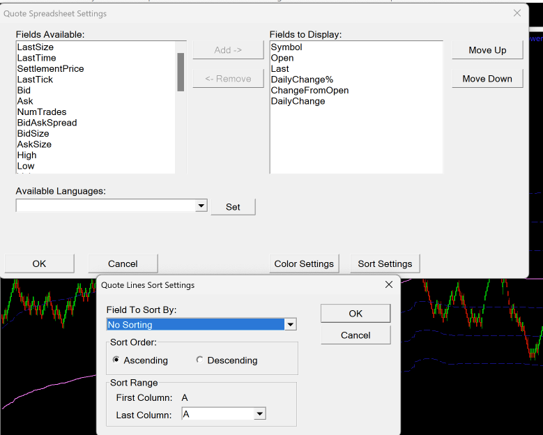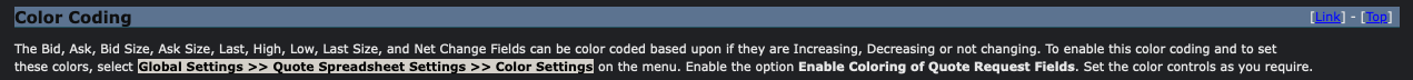 Think of the Quote Spreadsheet as a pre-filled spreadsheet with certain information displayed. As such, it is not setup the same as the Quote Board, and does not have the ability to sort within groups, as it does not know about groupings. Since there is no option for specialized coloring within the Spreadsheet in general, there is no support for this for user created fields in the Quote Spreadsheet. For the most reliable, advanced, and zero cost futures order routing, use the Teton service: Sierra Chart Teton Futures Order Routing |