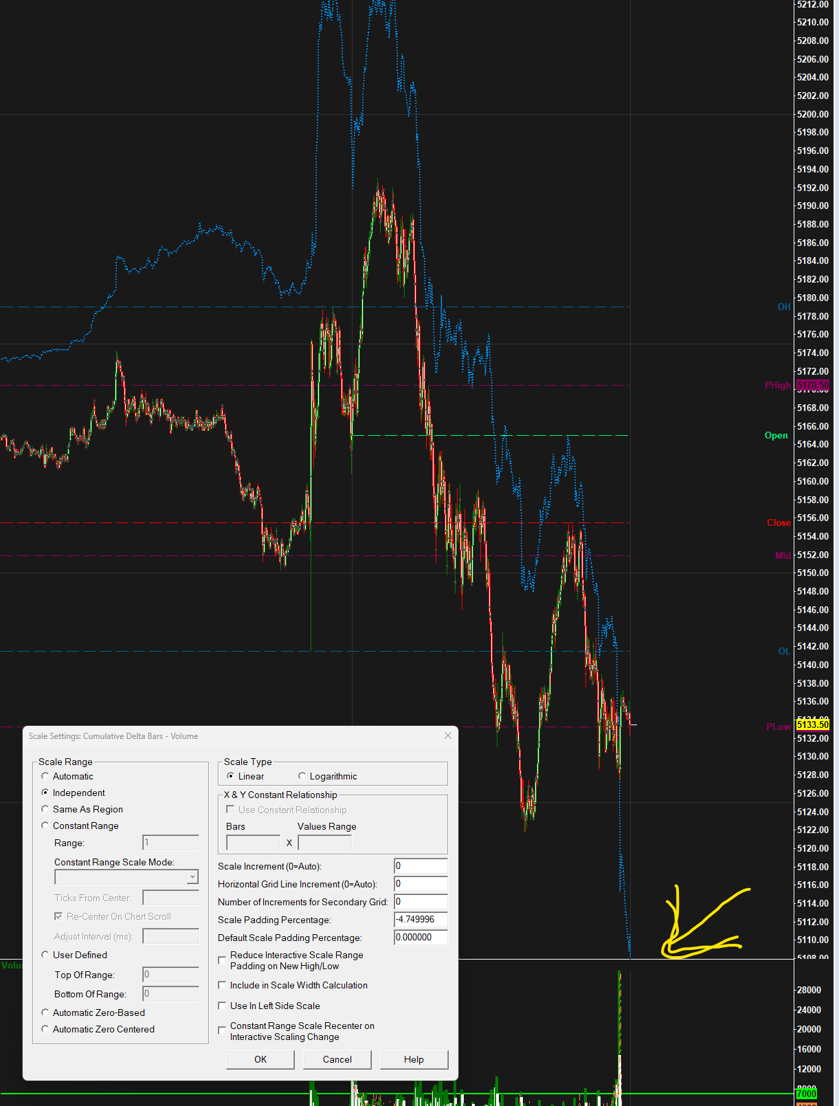 Hi I have an indicator on chart region 1 as a line on close over my charts. I have tried the scale on independent and auto zero centered because it is Cumulative delta. When I have the main chart scale settings as constant range the indicator would occasionally go of screen when it get's too high or too low. When I have the main chart setting scale set to automatic it is fine however I prefer to have my charts on constant range scale view. Is there any way I can continue to use this constant range view and not have the cumulative delta going of the chart? I have attached an image |