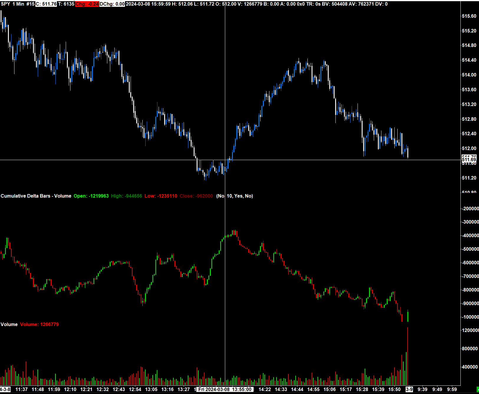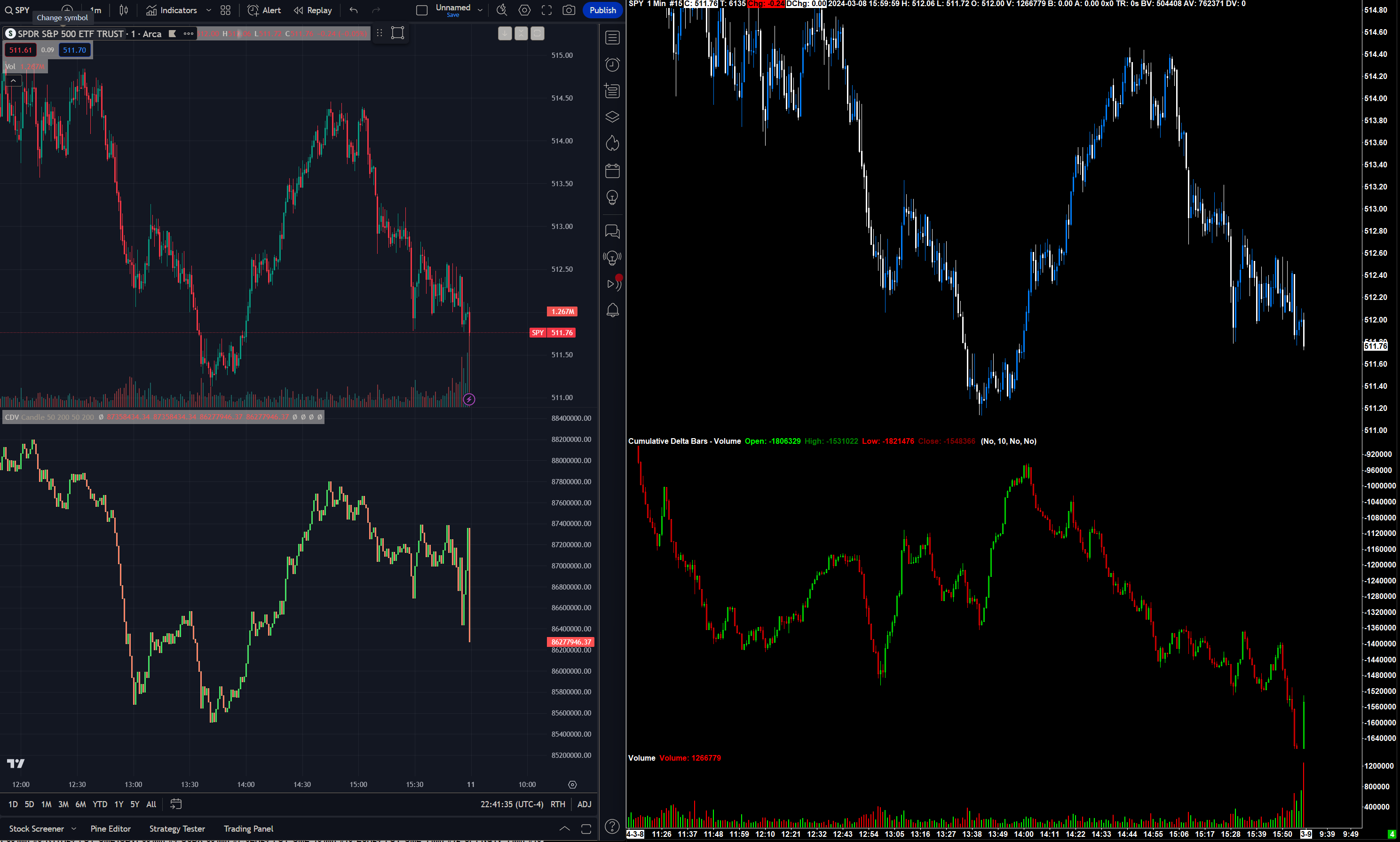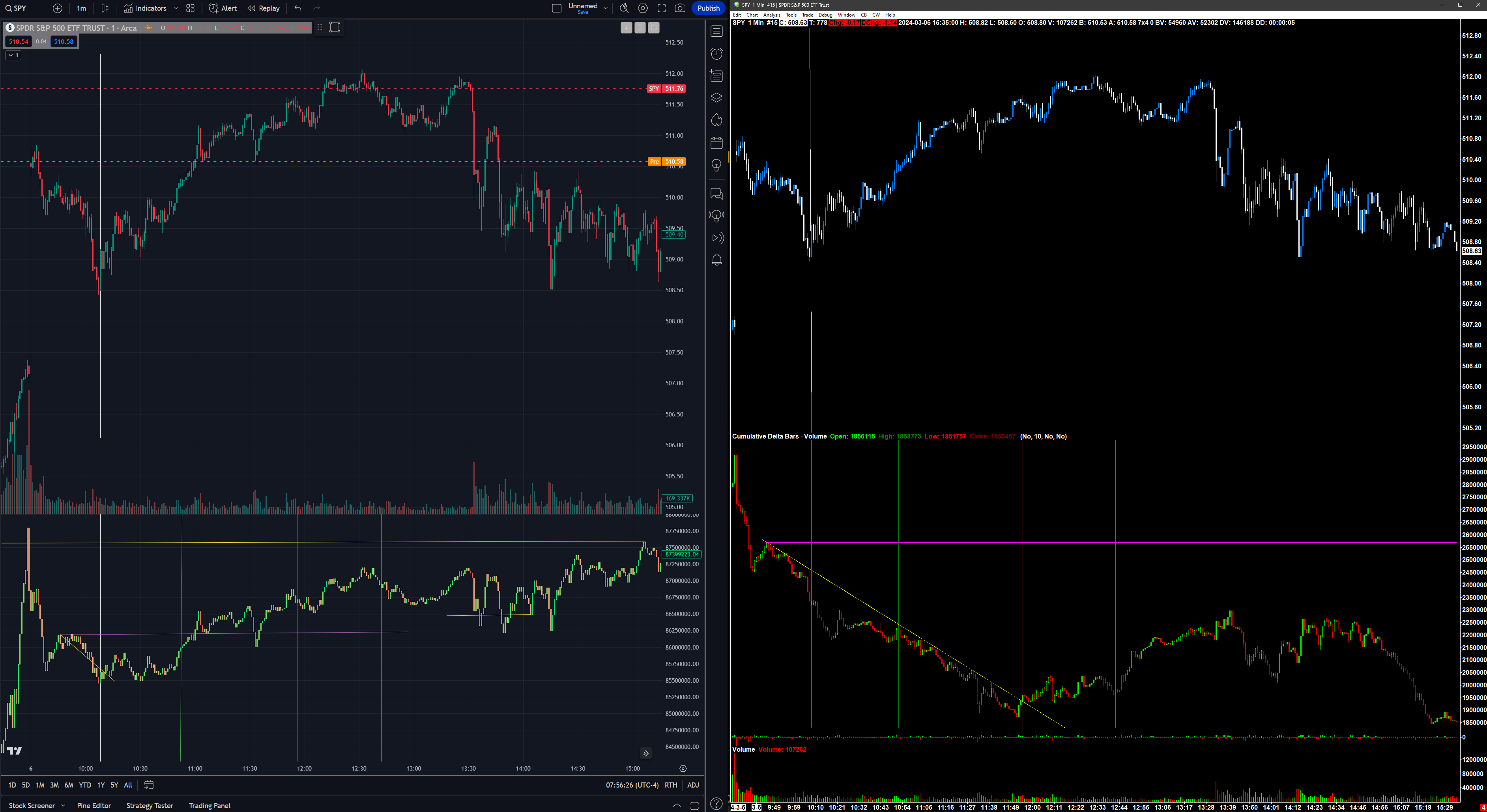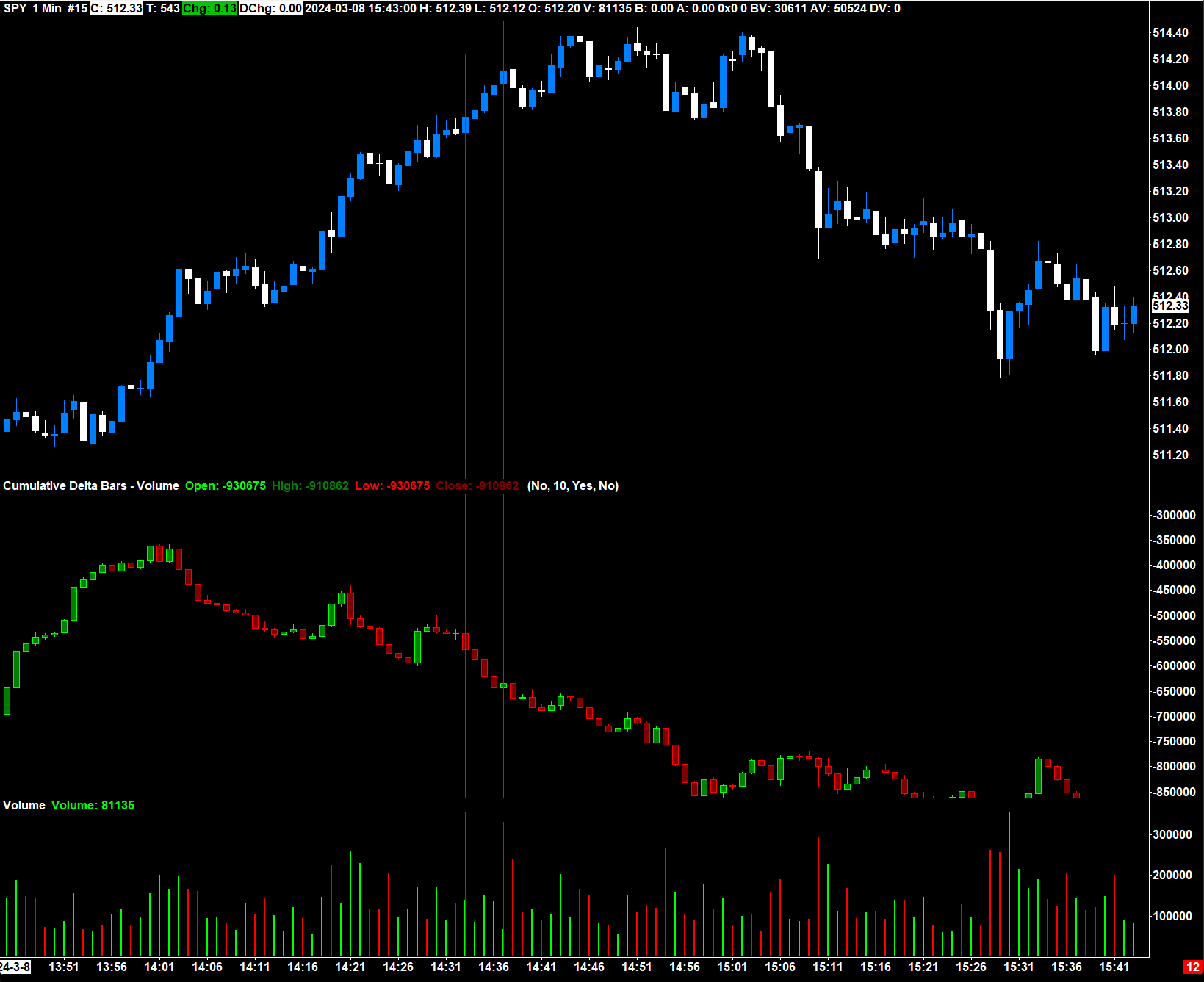 If there are more net sellers, net volume being done on the bid. First I thought the massive volume price divergence was weird. Because I knew ES was not going to look like that. I pulled up SPY on trading view and saw CVD, how I thought I would, trending upward with price, opposite to SC CVD. And TW CVD match up with volume, and volume matched up with candle stick color. So in SC on SPY consolidated tape I looked at Volume to CVD in SC and it didn't match up that well. Then I compared Volume study to Price candle stick color and that was 100% correct every green bar matched with every blue candle, and every red bar matched with every white candle. And I did the same for ES futures, every volume bar matched up with corresponding color, in this same time period that we are looking at spy. March 8th 2pm - 3pm EST. So Total volume is a combined ask + bid volume with no net difference calculation, and shows the larger volume side based on color, shouldn't that color match up with CVD and/or ask/bid volume difference bars, because those two studies show the predominate side, and momentum of buyers or sellers on a histogram or chart basis, matching the predominate color in volume study. EDIT* Someone pointed out to me that the Volume study... is not calculated from the predominate volume of bid + ask, and that it is calculated according to price Open/Close color change..... Nonetheless TW CVD is very different than SPY consolidate Tape. TW CVD makes more sense following the usual trend with price. Seeing a completely negative correlation between Price and CVD for over an hour. Is an anomaly. You won't see this happen in Futures and that's all I've been looking at. This is the first day that I've become aware of this on SPY Date Time Of Last Edit: 2024-03-11 02:44:45