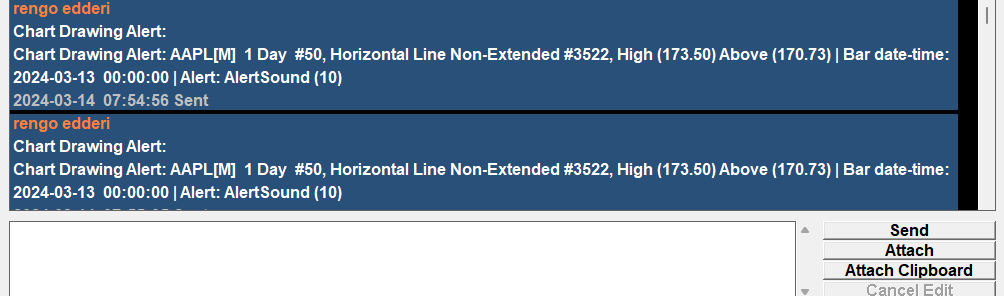 @John idk where to put this, but there are not taking screenshots of the chart anymore when a signal is triggered. This worked perfectly and were send to telegram until last week. Any Ideas? The signal/alert tho finds his way to telegram. BTW - Starting new Chat makes Sierra Crash right now. Using Current Update. Edit: Starting New Group works, but also with no screenshots taking. Date Time Of Last Edit: 2024-05-17 10:09:06