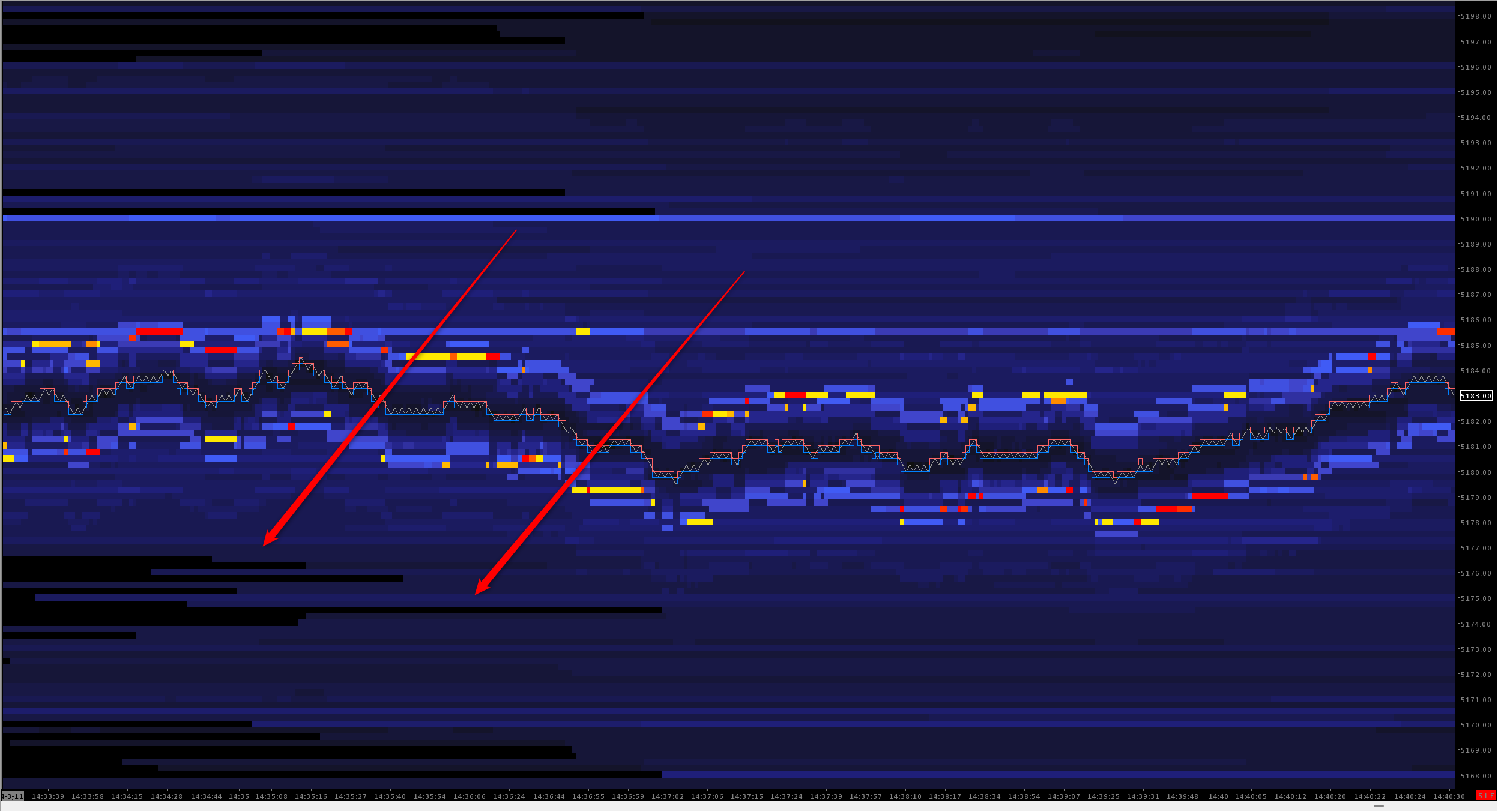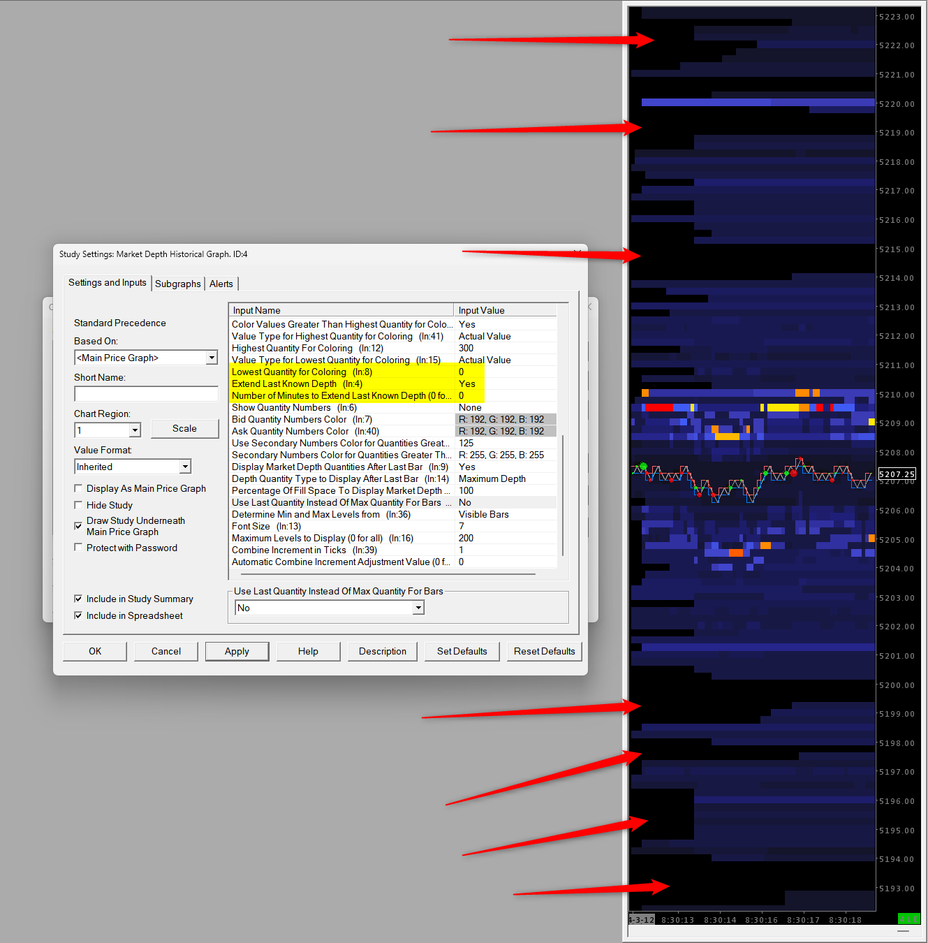 Can you tell me why the Market Depth Historical graph will periodically reset itself? I'm attaching a screenshot for reference. You can see every so often the depth graph will reset itself and will not fill in prices until the resting bid or offer at that price level changes quantities. The screenshot shows roughly 8 minutes of price movement and the depth graph reset 9 times. The depth graph is set to 0 for lowest quantity for coloring. With this setting I should never see any area on my visible depth where there are 0 resting orders. I thought maybe I could use "Extend Last Known Depth" as a workaround, but I still get these strange areas on my chart where depth isn't filled in (see Work Around image). How can this be resolved? Thanks! |