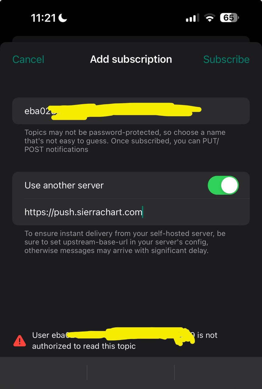 We no longer support Telegram for remote alerts. Refer to the following: Notice: New Mobile Alert Notification Service Available Now! For the most reliable, advanced, and zero cost futures order routing, use the Teton service: Sierra Chart Teton Futures Order Routing |
