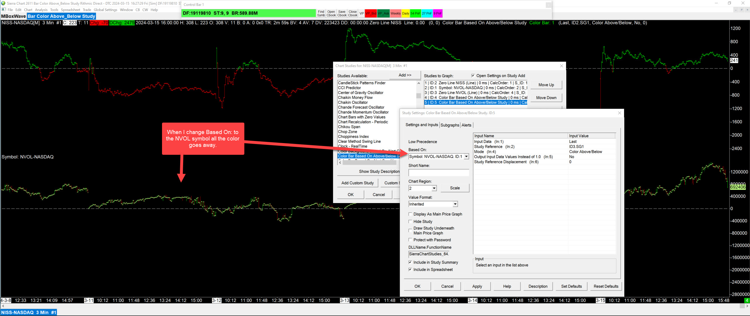 I add an additional symbol to region 2 and then add a Line study set to the zero line. And then when I add Color Bar Based on Above/Below study set to the subgraph zero Line study, some of the bars are red above the zero line when they should be green. I also noticed the reverse is never true - bars below the zero Line study are always the properly color red. Picture is attached. |