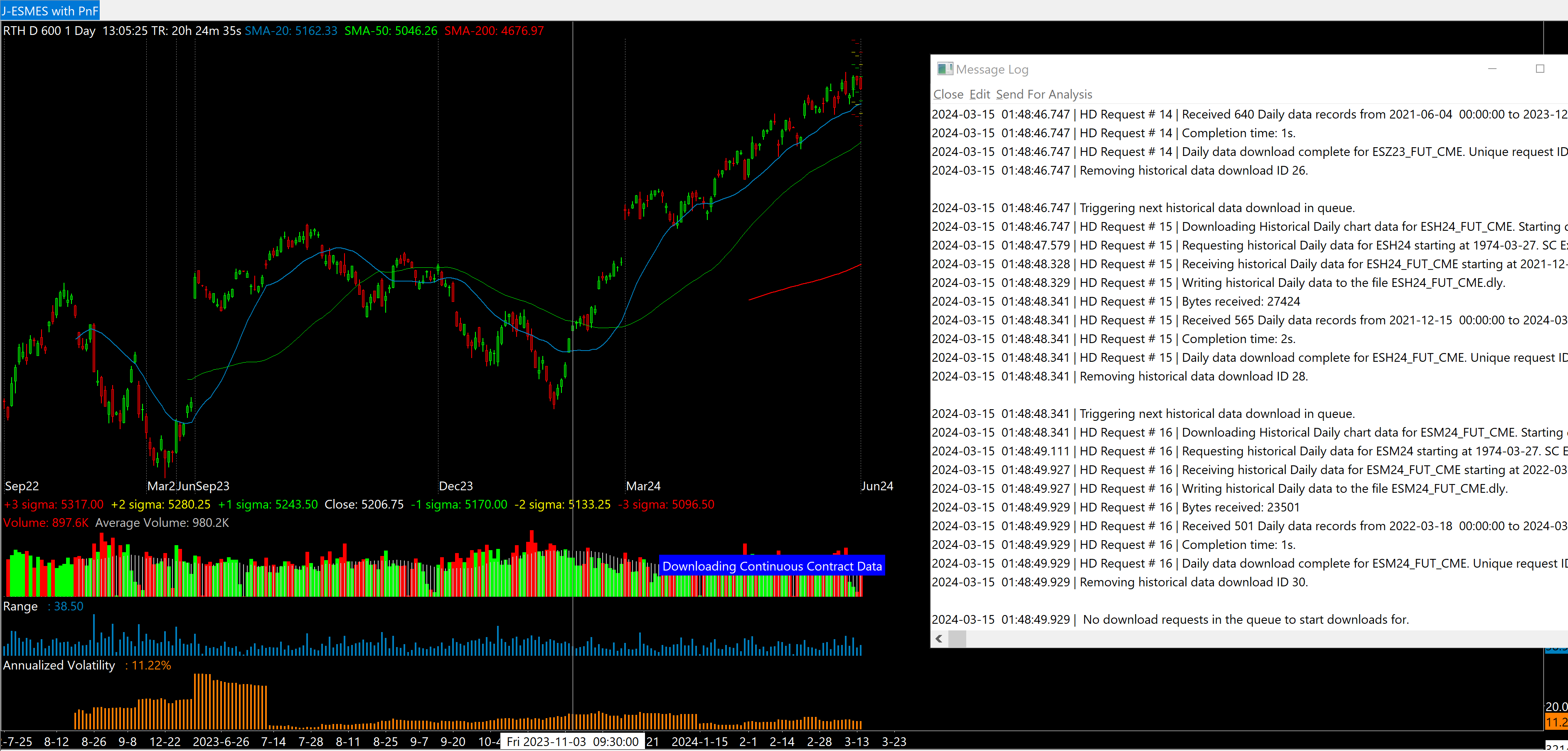 Hello, I faced a similar issue as was posted on the forum as a sticky about incorrect back-adjusted prices. However before seeing the post I had tried to redownload historical intraday data to see if it would fix the problem. Now my problem is that I am missing big chunks of data for old expired contracts. I'm using Denali, my broker is EdgeClear. I have a 30 minute chart that goes back 1 year so I can see historical volume profiles. I also have another 'daily' chart that goes back 600 days (see image 600day) to see large chunks of data that are missing. Right now I followed the instructions for Re-downloading continuous futures contract data Continuous Futures Contract Charts: Re-Downloading Continuous Futures Contract Data When the download starts, the message log shows several downloads running and then being completed then moving to the next symbol however the files are tiny. (please refer to log) The multiple contract downloads take less than 10 seconds. Then the Message log says there are no more download requests to start however the blue box on the chart still says "Downloading Continuous Contract Data", and other charts have the yellow box saying "Waiting to Download Historical Data". It seems like the downloads aren't actually being done since my historical data files are unchanged in size and are pretty small. I have also tried doing this on a 5 minute chart but I don't the option to download expired contracts' data - I'm limited to only the current ESM23. I'd like to be able to go back to at least ESH23 as well but the option for ESH23 doesn't show up. I have tried two different internet connections (at home and at work) Date Time Of Last Edit: 2024-03-15 06:12:36