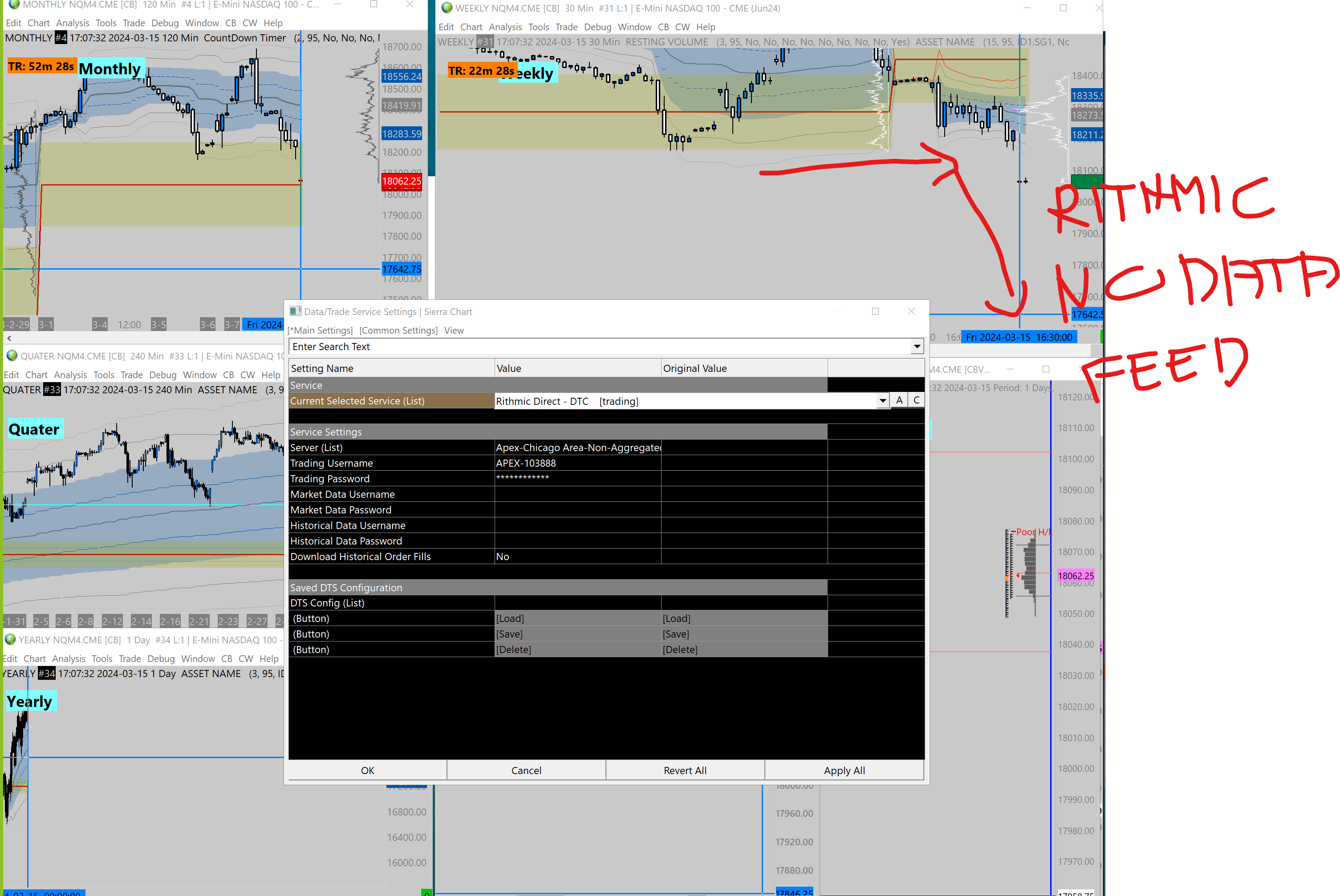 Hi, I bought the denali data feed (you can see the attachment piece) I connect my apex datafeed throught ritmic and I lost all the datafeed when sierrachart is closed. And if I remove the rytmic datafeed I cannot take the trade for the Apex test Could you help me to use denalidatafeed and to trade for the Apex test ? |