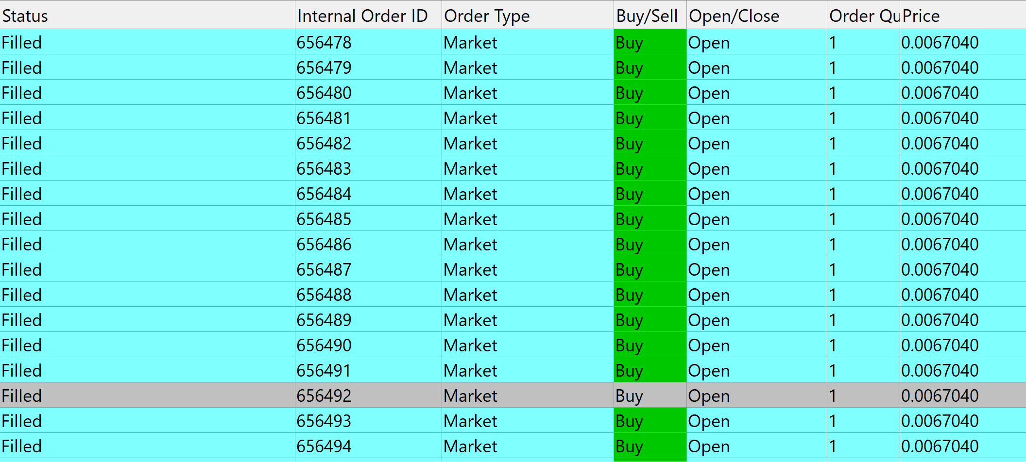 I've tested changing the order type to MARKET and I'm still experiencing the same behavior. Even though I'm submitting Market orders, OCOs are still being executed somehow, albeit only for the base symbol. The second symbol is continuing to accumulate orders in the working orders queue but nothing is being executed. Essentially, a single order for the second symbol is being submitted, the queue is exponentially increasing at the same price as if the same order is being submitted several times, stating they are filled, but there are no executions for the second symbol. I've attached a view of the Trade Orders Window, displaying the behavior of the second symbol. |
