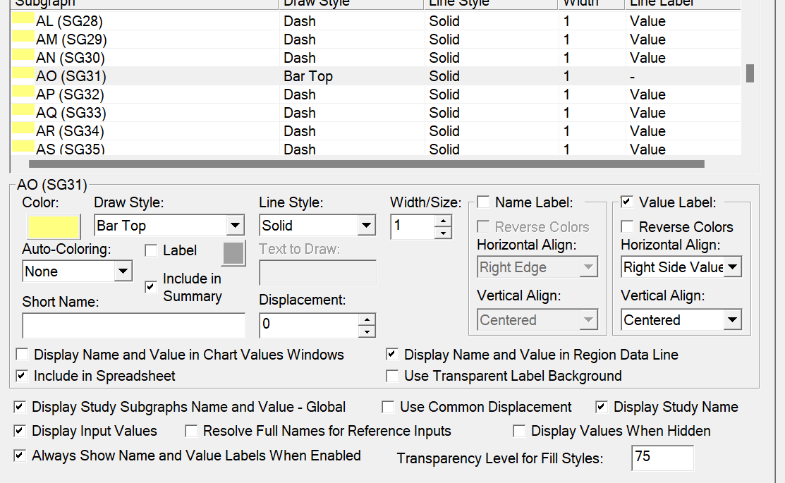 You are displaying that value in Region 1. Since the Time is a very small value (less than 1) it is trying to display at that level. If you want to display this in Region 1, then you will need to set the Scale to Independent. Also, depending on what the values are like, you may want to have the values be in one line across the graph. To do this, you need to expand the scale for that study so there is a large range of values displayed, which will cause the numbers to appear as a single row. To do this with the scale set to Independent, you would need to add the "Left Side Scale", and then set the Scale for the Spreadsheet Study to enable "Use in Left Side Scale". Then you can adjust the scaling. You can turn off the Left Side Scale once you are done with the adjustment, if you do not want it displayed further. Refer to the following regarding the Left Side Scale: Chart Settings: Use Left Side Scale (Chart >> Chart Settings >> Scale menu) For the most reliable, advanced, and zero cost futures order routing, use the Teton service: Sierra Chart Teton Futures Order Routing |