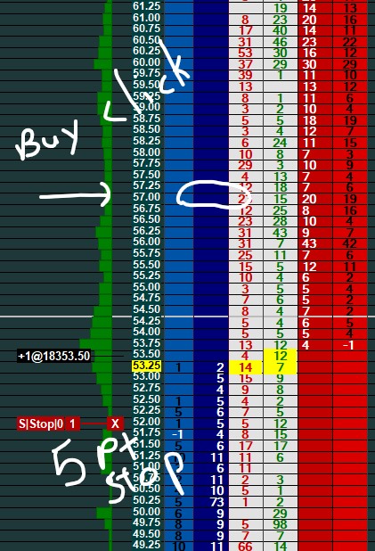 See Attached, when I click the bid column anywhere above the current price, it is supposed to enter at market at the top of the book. This will typically happen, but the problem I am having is when doing so, my 5 point stop bracket order will place the stop 5 points below where ever I clicked the price in the Bid column, which is above the current top of the book. When I enter this way it will place the 5 point stop in the wrong place. It is supposed to be placed 5 points below where the trade takes place and is executed. For example in the attached pic, the market is moving fast so I click the bid column above the top to the book at the 57.00 price, it enters and executes my order at 53.25. The stop should have been placed at 5 points below the enter price of 53.25 making the stop 58.25. Instead you see the system placed the stop at 52.00 which is 5 points from where I initially clicked to enter in the bid column. Am I doing something wrong or is there a setting that needs to be changed so the stop is put at 5 points below the actual execution price when entering by clicking in the bid column above the current price? Thanks for the help. |
