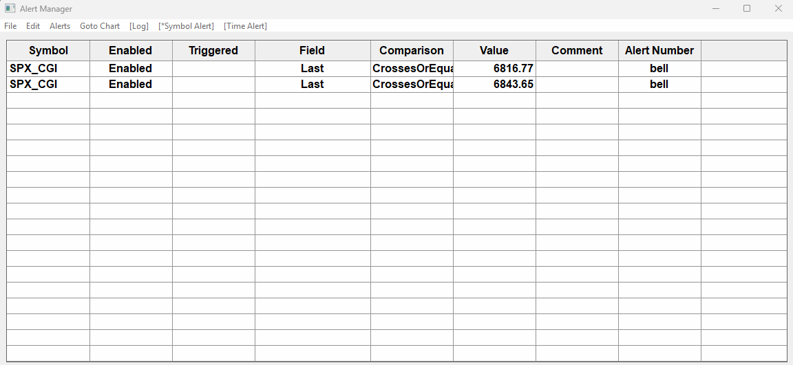 The only thing we can see is that you have the condition as "Crosses or Equal To", therefore the Last price has to touch, or move across the prices of 6816.77 and 6843.65. This has to happen while you are connected to the data feed. It should not matter that you are connected to Interactive Brokers. You are set to get the data for SPX from our Denali Exchange Data Feed, and you have the correct symbol for this. Let us know if what we describe in the first paragraph above explains why you are not getting an alert when you think you should. For the most reliable, advanced, and zero cost futures order routing, use the Teton service: Sierra Chart Teton Futures Order Routing |