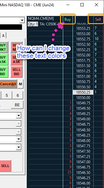 The settings that change the color of the "Buy/Sell" at the top of the columns are the following: - Chart/Trade DOM Buy Order Quantity Text - Chart/Trade DOM Sell Order Quantity Text Note that this will also change the color of the order quantities in the Buy/Sell columns if you have them displayed. But for the setup you show in your image, this will not be an issue, as you are using the combined Bid/Buy column. For the most reliable, advanced, and zero cost futures order routing, use the Teton service: Sierra Chart Teton Futures Order Routing |
