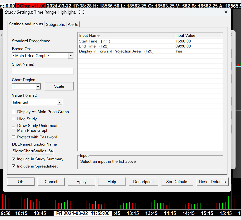 Hi Sierra Chart Community, I've been using the Time Range Highlight feature to mark out the overnight session, so I can clearly see where the NY session kicks off at 9:30 AM. However, I've noticed that regardless of the time frame I choose, the shading continues through the 9:30 AM candle. I'd really like the shading to stop just before the 9:30 AM candle on all time frames, so I can easily pinpoint the start of the NY session. Is this a bug? Is it possible to change a setting to ensure that the 9:30AM candle is not included in the Time Range Highlight to make sure the opening candle of the NY session is not included in the overnight session and so the open is clearly demarcated? I tried rolling the Time Range Highlight end time for this study back but then realized if I switch to a 15min chart then the end of the overnight is even more off base so changing the end time is not a good solution. I've confirmed that the end of the Time Range Highlight on Sierra Chart, with end time set to 9:30AM, is one candle late based on the 9:30AM candle for the same session seen in the Trading View screenshot. Thanks for your help! Date Time Of Last Edit: 2024-03-23 03:29:53