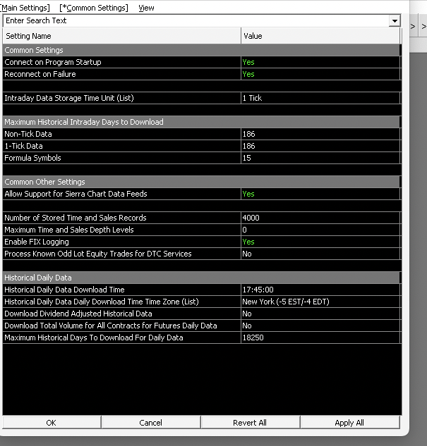 mY setting for ' DATA TRADE SERVICE SETTING " >> COMMON SETTING IS SET >> ALLOW SUPPORT FOR SIERRE CHARTE DATA FEED ...is set to YES . They Symbol is the EMI S&P .. I realized I did not download the current version . Hopefully it will be fixed by tomorrow . The symbol is the EMINI S&P .. thank you