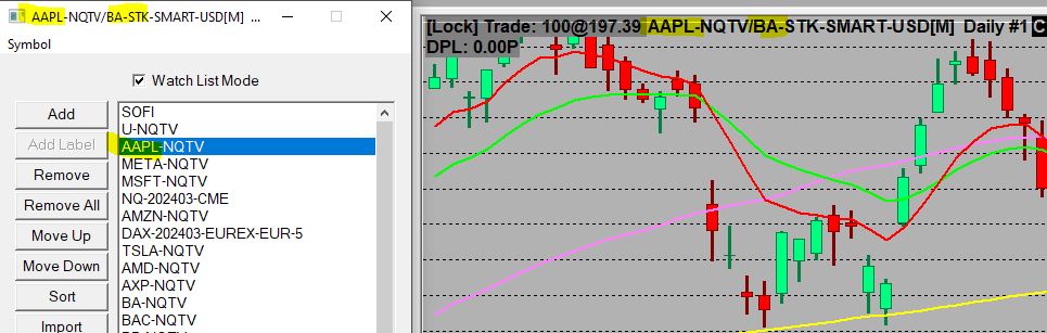 Dear Sirs, I try to find better way to use the associated watchlist. I trade stocks through Interactive Brokers. Pain point is that, when i use associated watchlist, it is only changing the 'Symbol (Action)' on a chart. eg. AMD-NQTV. To trade stocks, i also need to change 'Trade and Current Quote Symbol (Action)', eg. AMD-STK-SMART-USD. This latter one is not changing via associated watchlist, at least not by default. Is it possible to make this to be changed too when changing the symbol from watchlist? Thanks! BR Jarno |