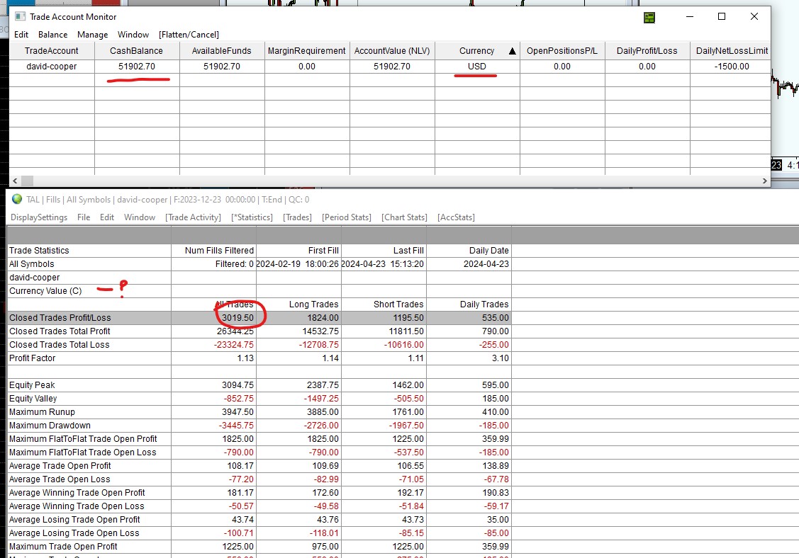Thank you for the documentation. I have carefully reviewed everything and have the following issue still: Currencies and PnL are correctly shown on DOMs, However the Trade Account Monitor is wrong. The account is listed in USD and that is correct. However, all my Eurex EUR trades show for example "20" PnL in the Trade Monitor when it should be 20 + conversion to USD. This is resulting in my Trading Evaluation with this respectable firm to be much less than it is :( I have crawled all docs on your site, i have made sure a EURUSD chart has loaded, currency conversions are happening correctly on the DOM. They are just not be converted and reported correctly to the trade monitor. Any further advice please? Thank you. Date Time Of Last Edit: 2024-04-24 08:16:23