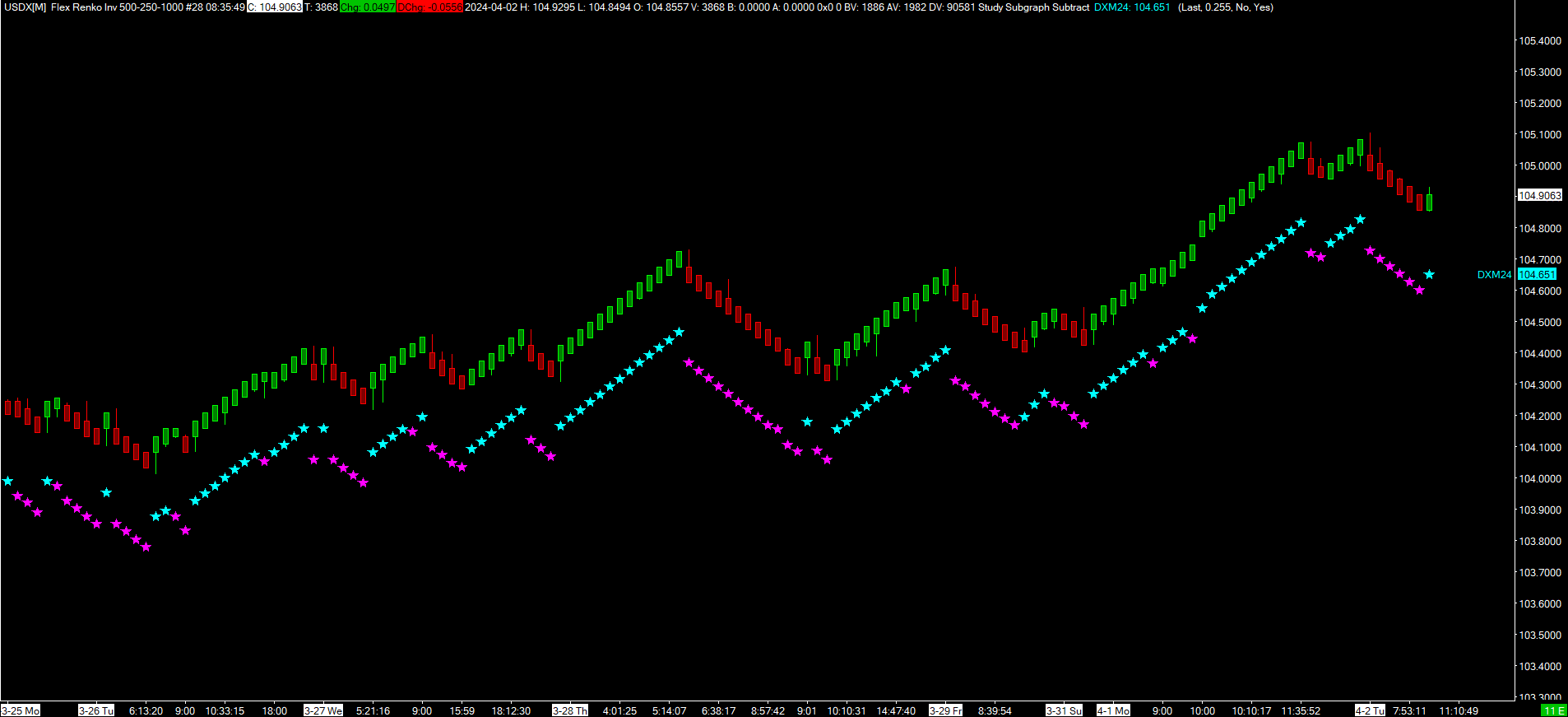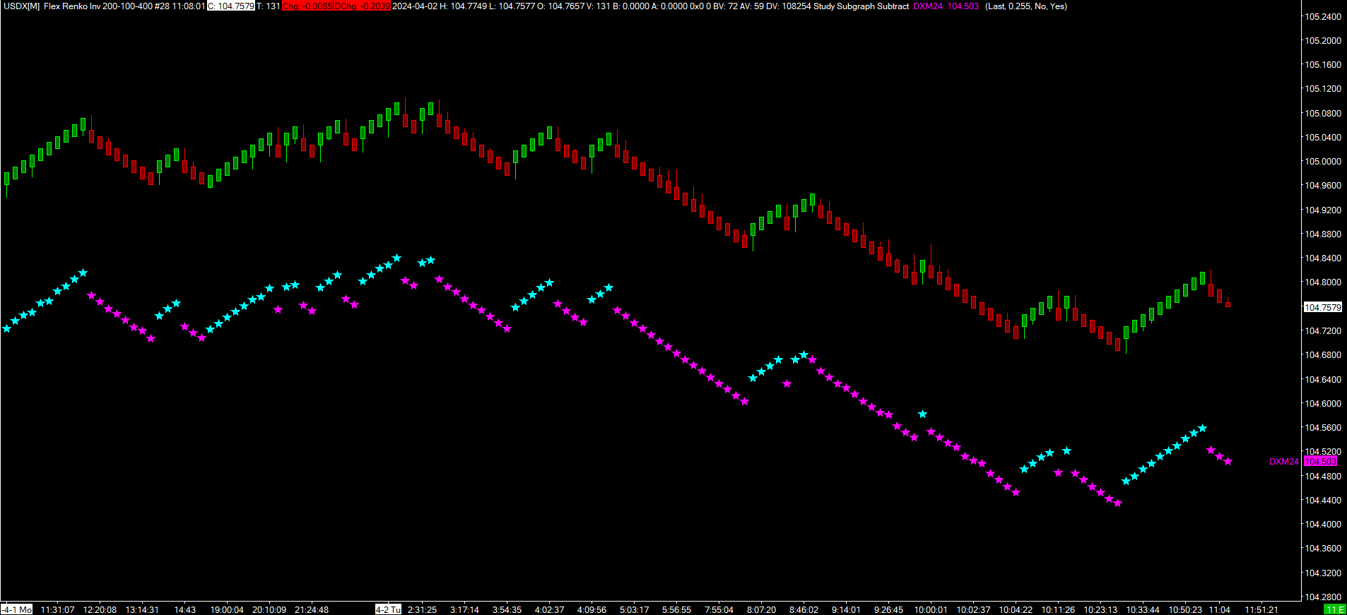 I use a work around. 1) Symbol USDX is available in SC under FX Indexes. Create a clean chart for USDX. USDX is real-time data. This is equivalent to DXY in TradingView. I use a Flex Renko Inverse chart SC for USDX. You can use 500-250-1000 or 200-100-400 for the settings. 2) Investing dot com has real-time derived data for US DX Dollar Futures DXM24. https://www.investing.com/currencies/us-dollar-index-streaming-chart 3) Subtract the DXM24 price (2) from USDX price (1). This is 0.255 today. Check everyday. 4) Add the Study Subgraph Subtract study to the USDX chart. Set the amount to subtract to 0.255. Under Subgraphs change the Draw Style: Star and Width/Size: 4. You will end up with a pretty good approximation of the ICE DX Dollars Futures DXM24 real-time price. https://www.sierrachart.com/image.php?Image=1712061350256.png https://www.sierrachart.com/image.php?Image=1712070482730.png Date Time Of Last Edit: 2024-04-02 15:17:18