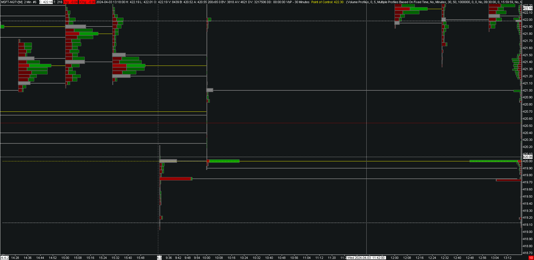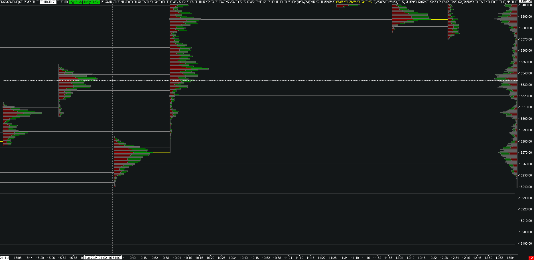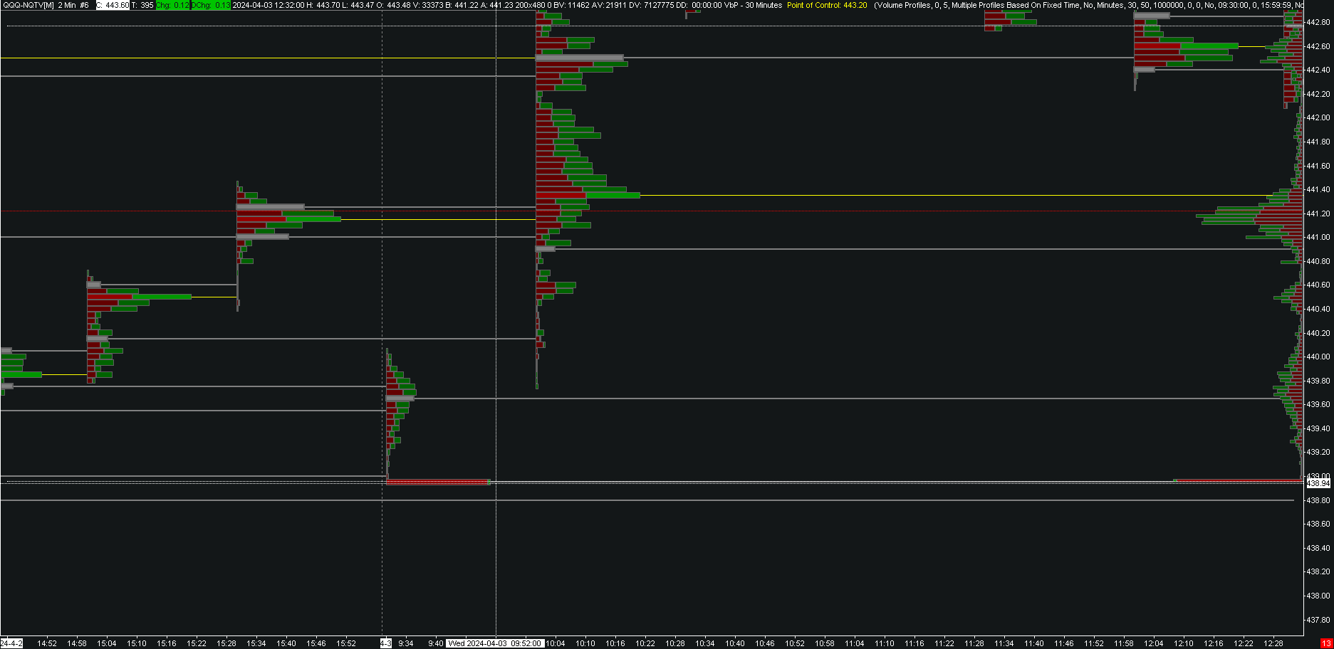 Hello Support, I have set up a 30-minute volume profile chart for stock but the volume profile for the first 30 minutes is incorrect. Most of the time, the first 30-minute volume profile only displays "Low Volume" when it should have the most volume or has the POC stuck at a particular price point. I suspect there is either some setting issues with my chart or there is a data issue. Please see the attached images for your information. The volume profile for QQQ should resemble the profile of NQ Date Time Of Last Edit: 2024-04-03 19:46:12