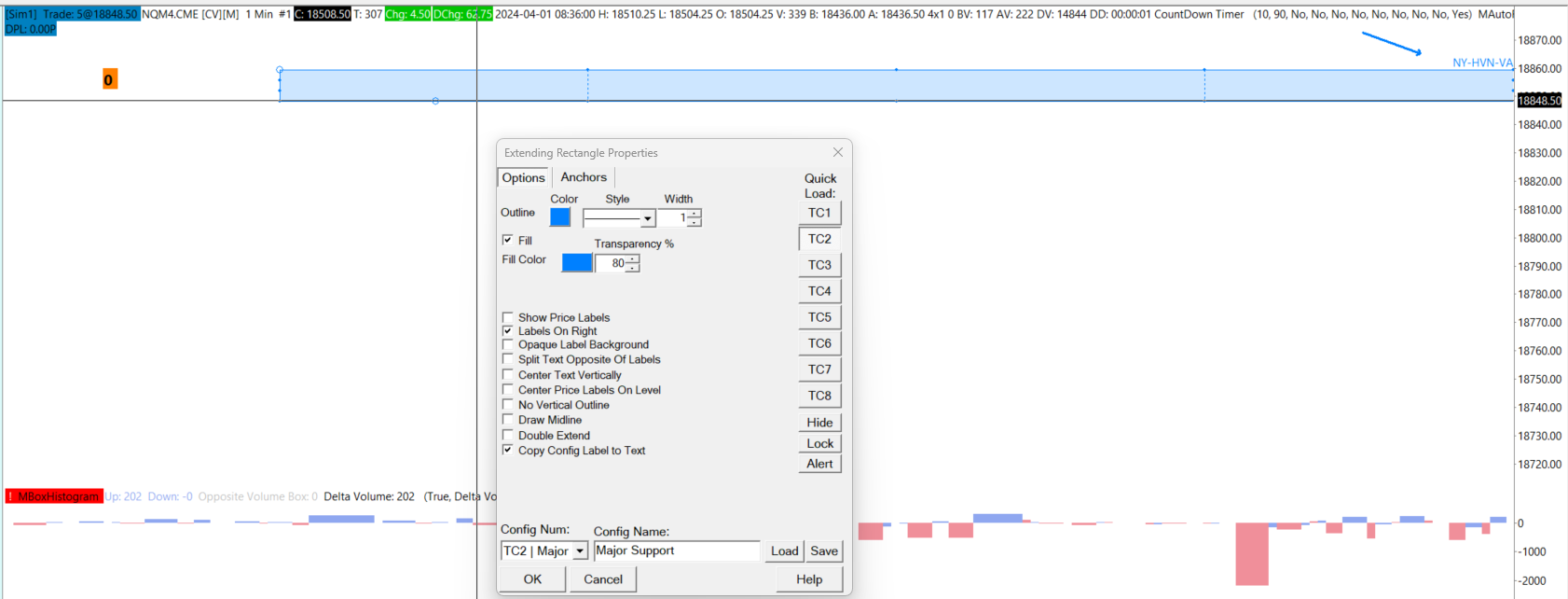 Dear SC, I have created several Config Templates for Support/Resistance lines and Rectangles. I normally add labels to the upper right of each line and rectangle. However, when I select a Configured Template and have checked to use the Config Label as the text it does not display the Config Label on the drawing. It appears as though the first two Config Templates I created work properly and display the correct color and text when I select either one. Then lately if I select Modify Text to manually add text, it does not add the text. Now, after trying to add my new Config Template that is blank, I right clicked on the rectangle and selected Chart Drawing Properties and loaded one of my older Config Templates (Major Support, image attached) and it added my new label for my new Config Template. However, if I right click on the rectangle and select Configuration (Major Support) it displays the correct text. This used to work better for me, although it never was easy. I should be able to create drawings with labels and turn them into templates to make life easier. I waste so much time with this software not working properly. It is truly maddening. Can you please look into this? And, if this does not work, I should be able to manually add text, which does not seem to work any longer. Thanks for the help. Tom |