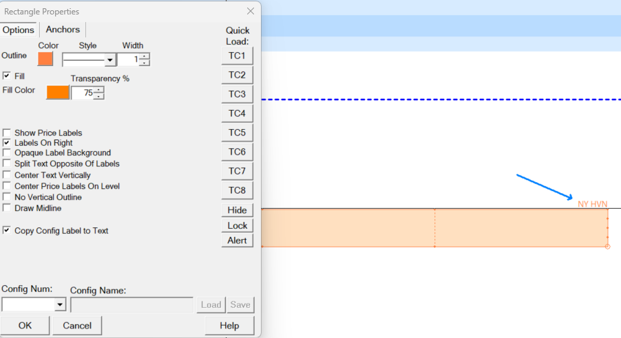 I'll check that. I figured out the issue though. If you look at the new attachment. If I right click on the rectangle and go into Chart Drawing Properties, then at the top, have an Outline that has color, not white that I had before, then it displays my text, either the Config Label Text or my manually written text. So, if you can fix that. I shouldn't be required to have a colored border in order for my text label to display. Thanks for the help. Tom