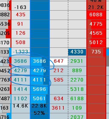 Please look at attached image, circled in blue: bid (blue) column and corresponding pulling/stacking column on its left. You can see that on those levels, bid level = exactly pulling stacking level. Also when bid level changes, pulling stacking is changed to exact same quantity. So for example in this case we have a bid level of 4111, and pulling stacking value of 4111. If bid changes to 4000, pulling stacking will be 4000. Is this how this is supposed to be calculated? I would have expected to see -111. |