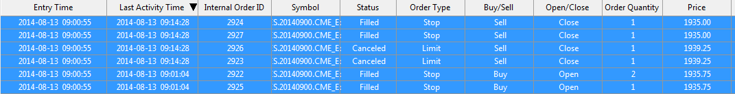 Resetting last modify Price and Quantity due to an apparent failed order modification. Internal order ID: 2923 | 2014-08-13 09:01:51 I thought perhaps this had something to do with the issue. But the times don't match with when I exited the trade, or when I moved my stop, so I dont know what the above is. I entered the trade at 09:00:55 as per the attached screenshot. At roughly 09:06 and again at 09:07 I tightened my stop closer. I presume that is not shown in any logs because I cant find it. At 09:14:28 I got stopped out of the one oco which had 2 contracts attached. However nothing happened with the other OCO. I had to manually flatten and cancel. As mentioned, the same thing also happened yesterday. Please advise. |