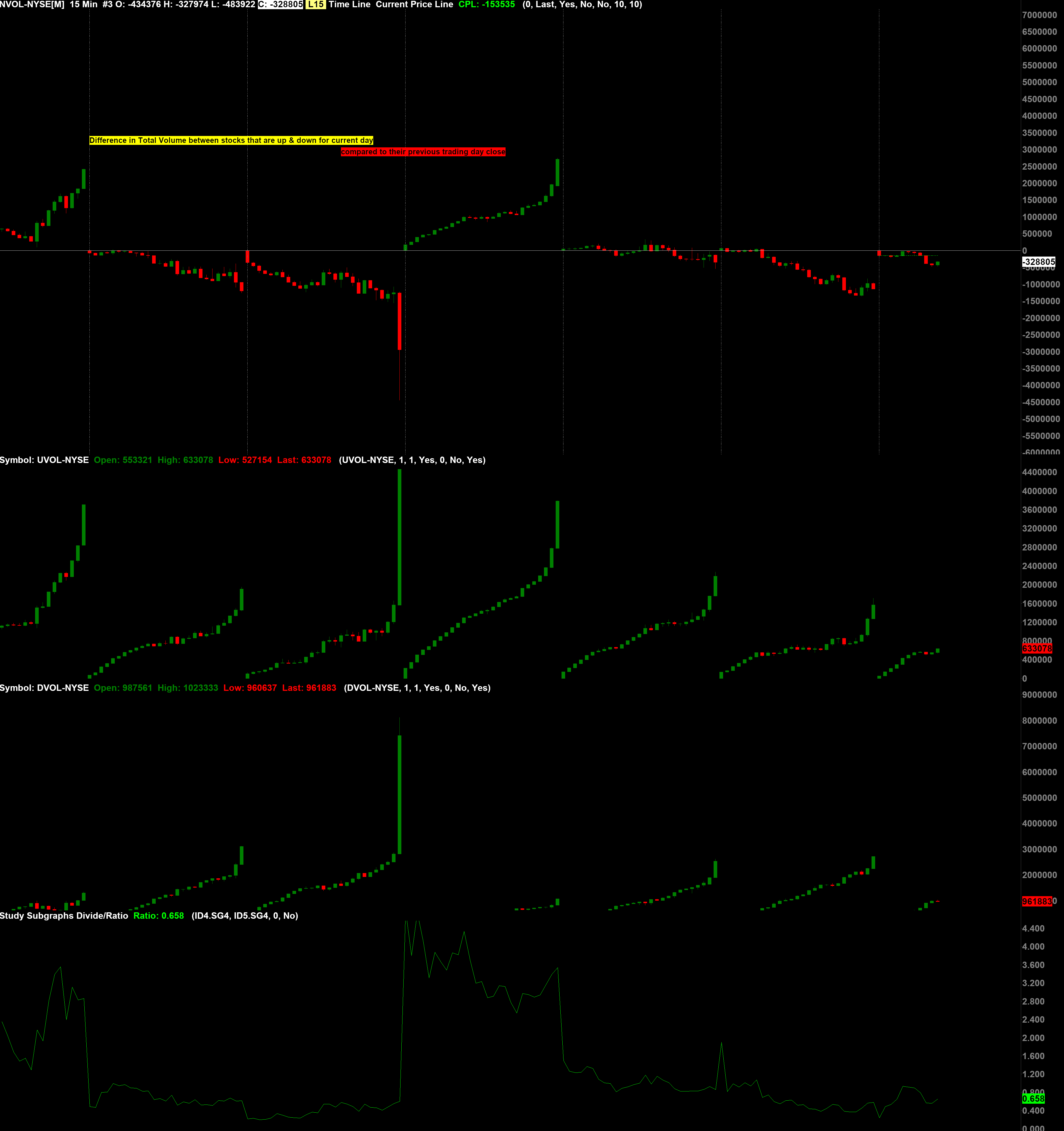 Yes, sorry below 1. I'm not 100% sure if I just need closing calculation, maybe you can point me to it. Attached is my screen shot from the Ratio I have calculated. I have the main Symbol as NVOL-NYSE. I also have added additional symbols UVOL and DVOL. and added Subgraph ratio/divide study. As you can see the volume is -ve and ratio is below 1. Taking inverse of this would be yield the -1.58. I'm trying to get to a point where I can either See the this value 1.58 in a Red Box showing -ve volume or a Green box value for a +ve volume. as I mentioned I have tried using studies you mentioned on another thread where the chart was UDVR-NYSE and it worked fine but I haven't been able to reproduce it when using a study Date Time Of Last Edit: 2025-03-27 16:13:44