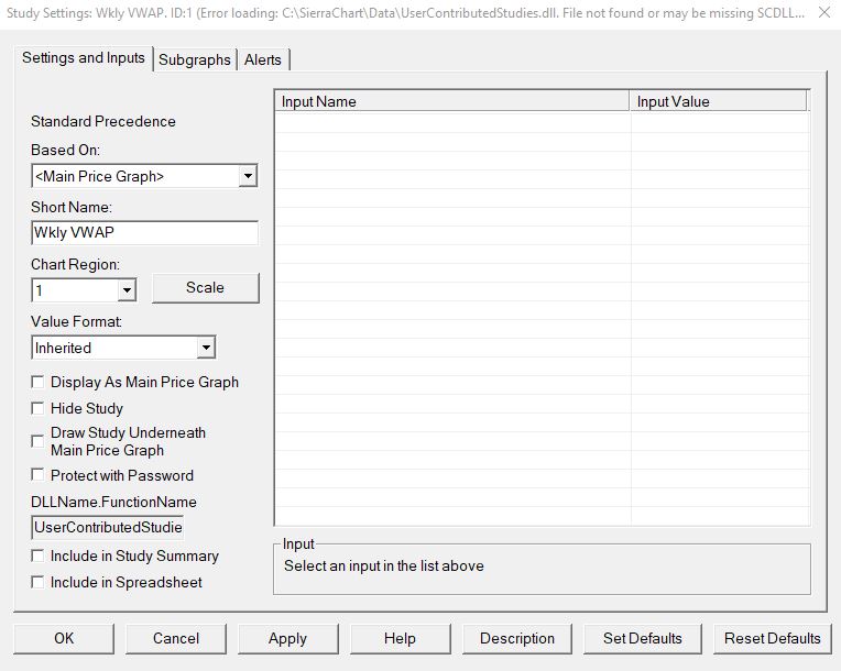 Hello Friends: My weekly/Monthly/Quarterly/Yearly VWAP charts have stopped working, reporting the following error: Study Documentation: Error loading: C:\SierraChart\Data\UserContributedStudies.dll. File not found or may be missing SCDLLName line. (see screen print attached) Can you help repair please ? Thanks in advance. Date Time Of Last Edit: 2024-04-08 20:56:20