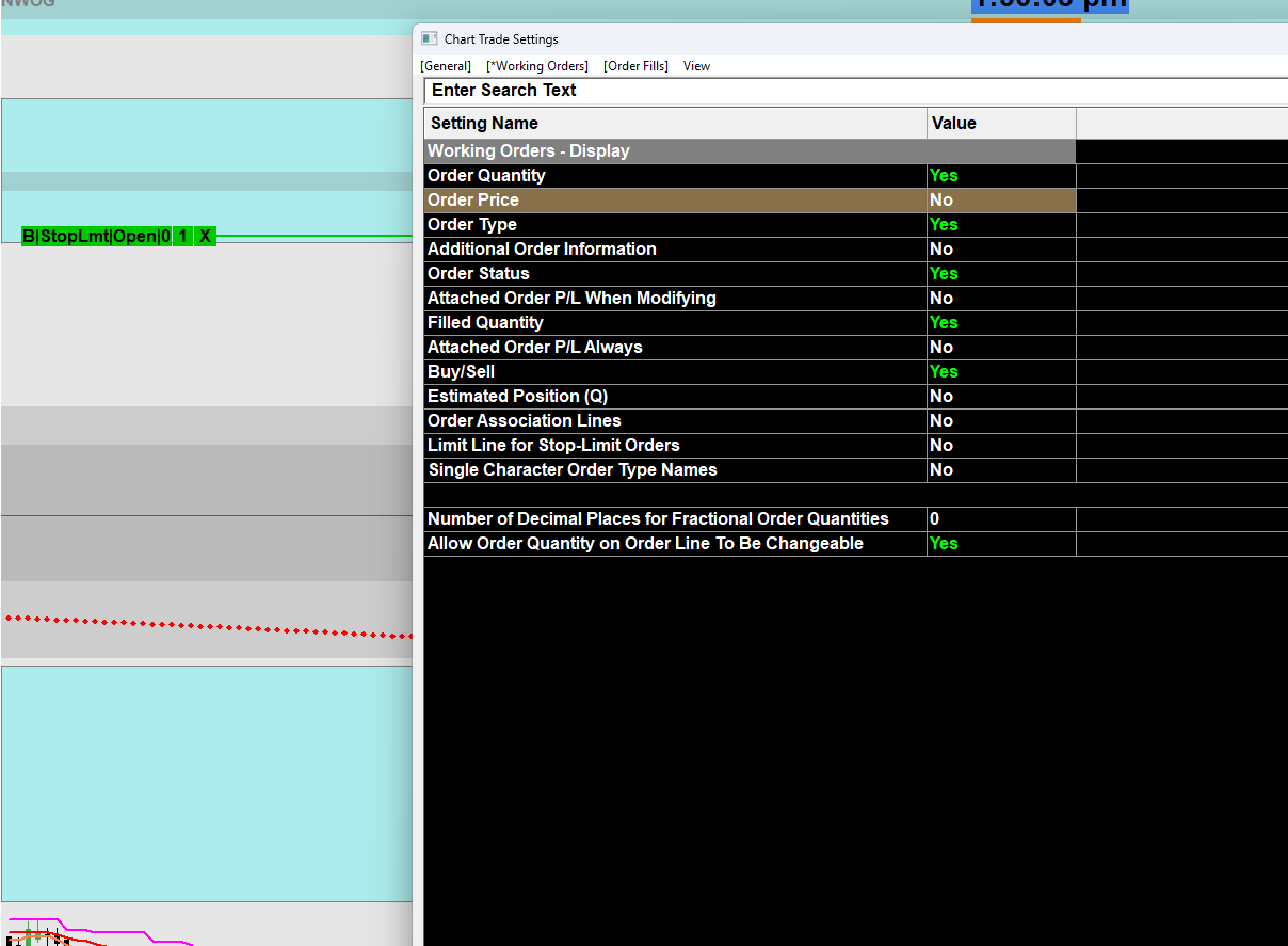 This did not resolve the issue. If you look at the first attached screenshot in this reply you can see there are 2 prices. It appears like this: "B(StopLmt)(THIS PRICE IS NOT NEEDED)|THIS IS THE ACTUAL PRICE WHERE THE ORDER IS SET|Open|0 1 X I explored all of the settings in the Working Orders panel and the only one I found that changed the displayed prices was the "Order Price" setting. When this is set to "No" it removes both of the prices displayed in the order. This is shown in the second screenshot. I also realized that moving the order up and down results in both the "NOT NEEDED" price and the "ACTUAL PRICE" changing values. I'm curious where the "NOT NEEDED" price is coming from and how to remove that price only. Date Time Of Last Edit: 2024-04-17 17:48:50