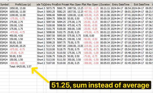 When using Currency Value & Points - ignore quantity in the trade activity log, can the Total line please show the sum of quantity ignored points instead of the average? It's difficult to add up each of the points to see how many points of actual market movement, ignoring quantity, were captured. It would be nice for a way to show this on the chart's NPL line too or in the header. Image explanation attached. You've built the most amazing software. - Long time and lifetime subscriber, Sean Date Time Of Last Edit: 2024-04-17 19:15:17