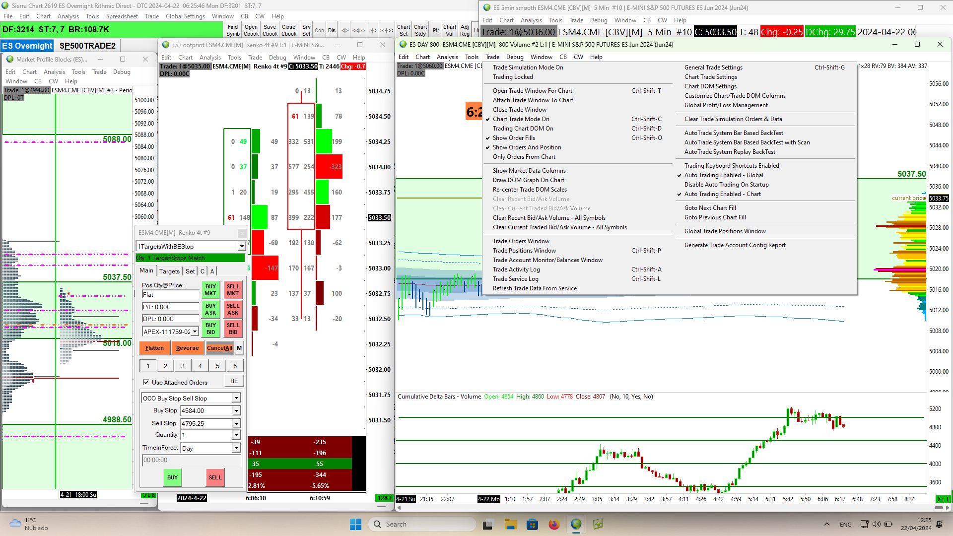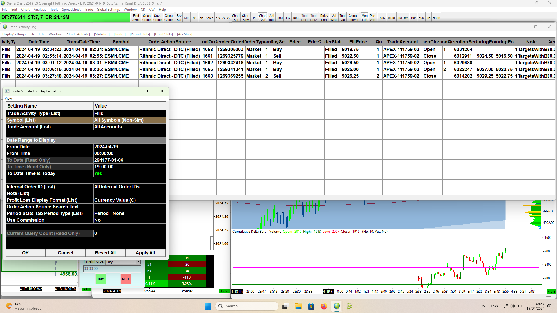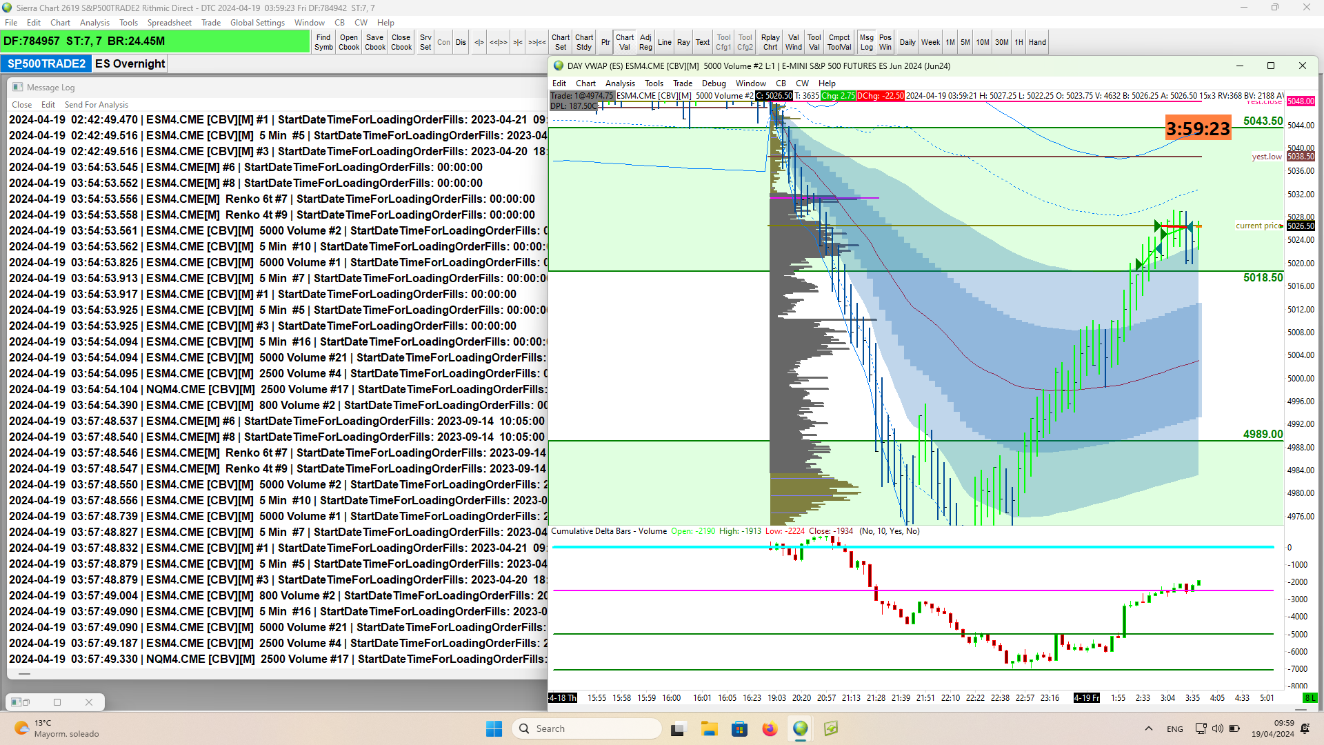 Hello John, Thank you for your quick reply. At the moment I can see my order fills in Sim and I will continuing back testing in Sim until it accursed again. But, I have noticed executing today the order fills are visible at an other Chartbook then the one I am executing from. The Chartbook where I am executing with is "ES overnight" (not visible) and they are visible in "Sp500trade2". Maybe I am missing something here. I send you the screenshots that I made. Thank you for your time, Have a nice day. |
