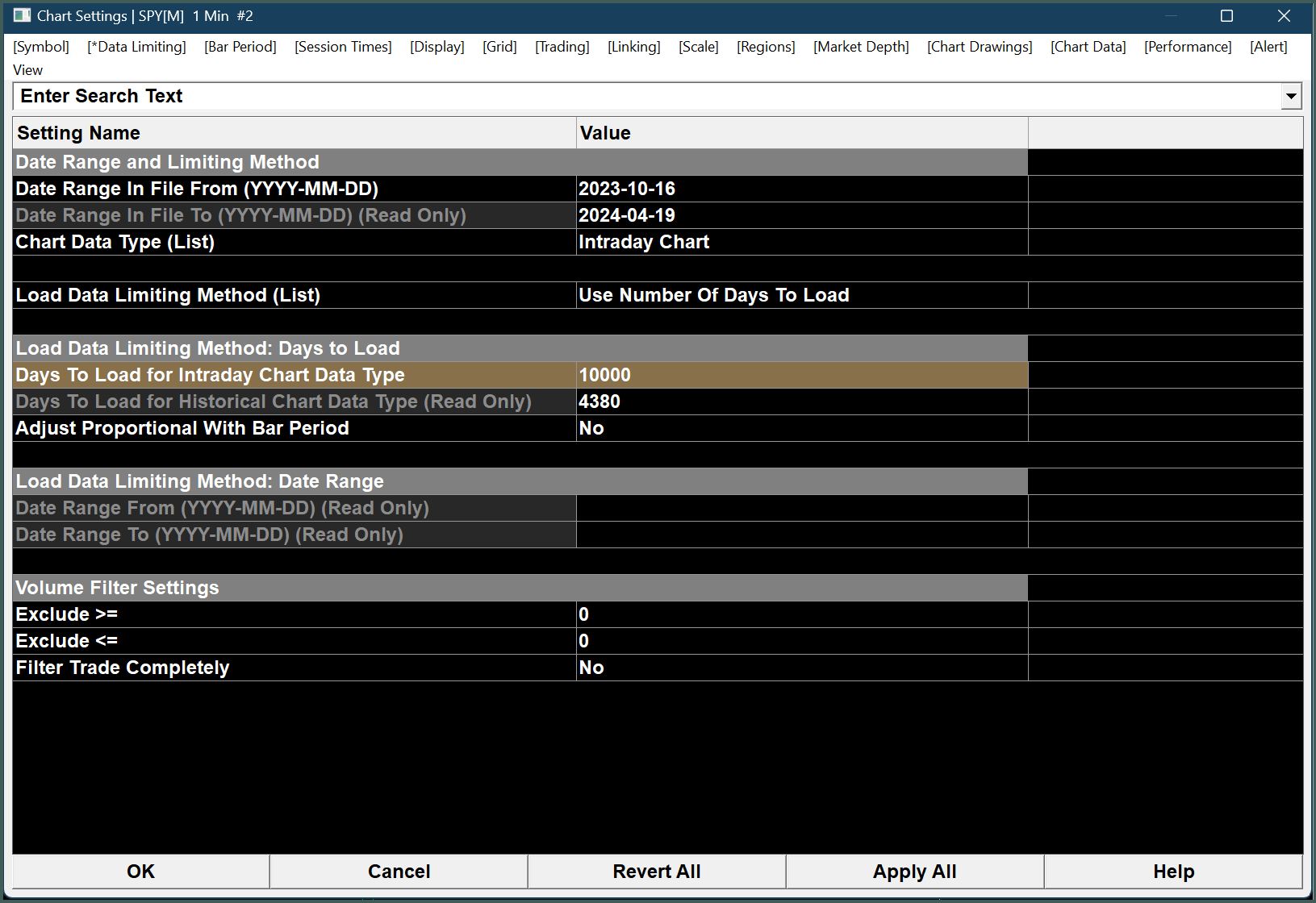 Hello, Is there a limit on the historical data available for 1-min playback? I purchased the Base Standard package with no data connection. I'm interested in historical chart replay on the 1-min timeframe only. I loaded a SPY chart, for example. The earliest date it goes back to is 10/16/2023. I would like to go back to 10/01/2022. I made sure to input "10000" at "Days to Load for Intraday Chart Type" but the Date Range in File From is defaulted to 10/16/2023. Thank you! |