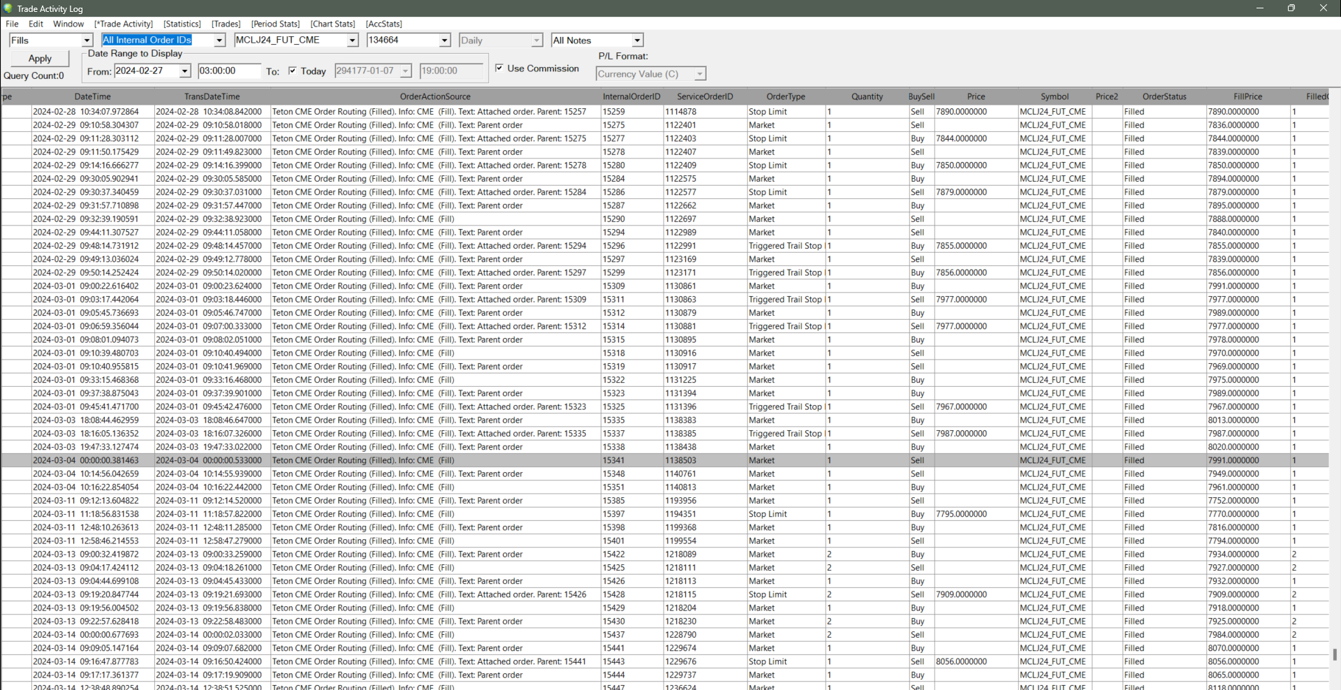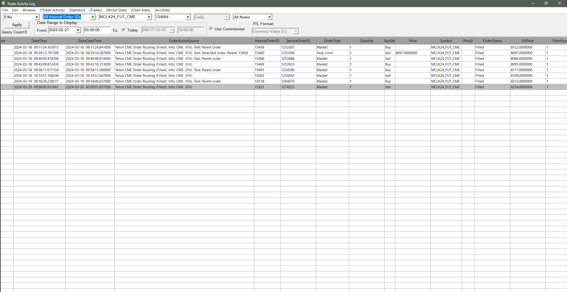 This is what we see: Orders 2024-03-20 00:00:00.902053 2024-03-20 00:00:00.902024 Flatten and Cancel at set time for Symbol and Account. Flatten&Cancel | Last: 82.549995. Current Position quantity: 1 | AO=0 15521 Market 1 Sell MCLK24_FUT_CME Order Sent 134664 Close 1 0.00 Day